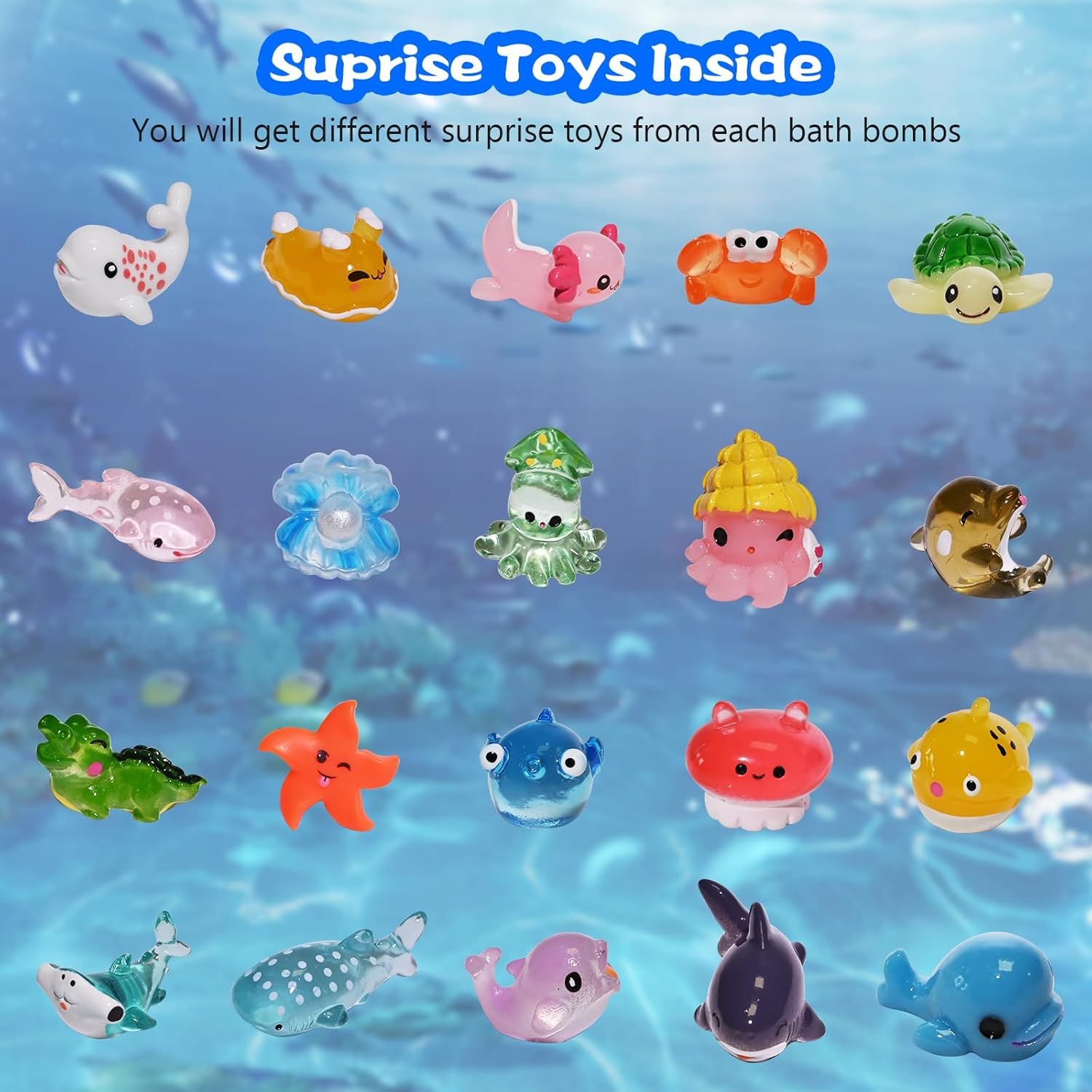 20 Pack Bath Bombs for Kids with 20 Different Sea Animals Inside. Guess What’s You Will Get: