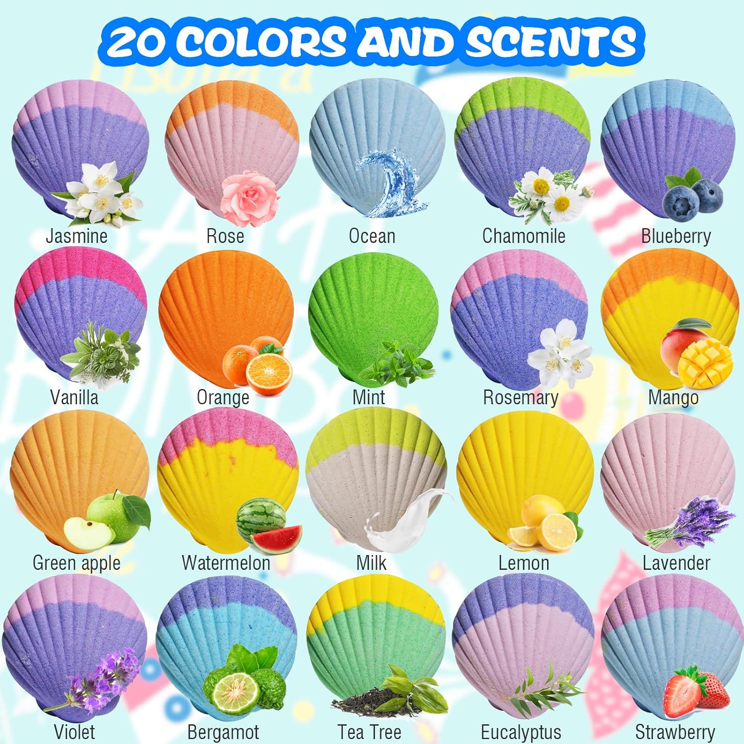 20 DIFFERENT SCENTS- You can choose your favorite scent and enjoy the bath time. 20 unique scent: Lavender, Rose, Tea Tree, Peppermint, Jasmine, Lily, Bergamot, Strawberry, Vanilla, Chamomile, Ocean, Orange, Lemon,Violet, Rosemary, Green apple, Cherry, Blueberry, Grape, Eucalypt.