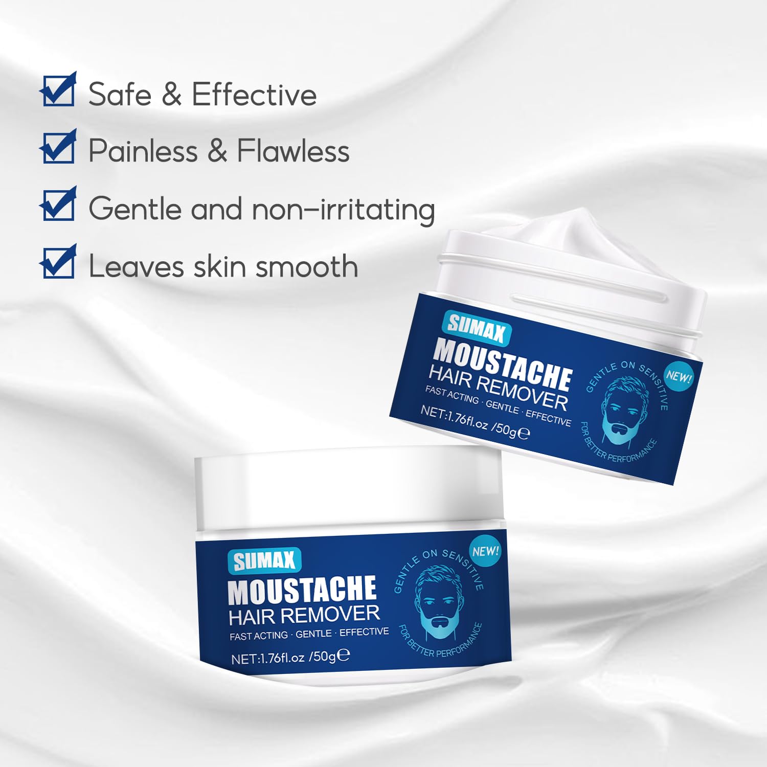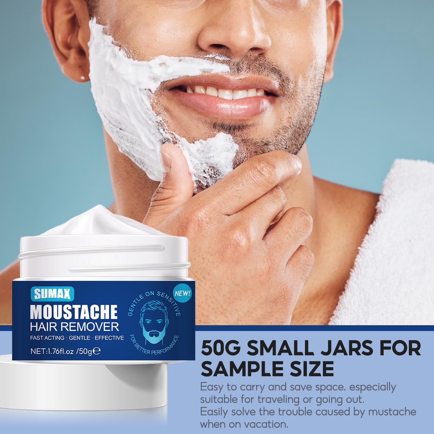 Mustache Hair Remover is a hair removal cream that effectively removes male beards, and can also be used to remove hair on body parts such as the chest and abdomen. 50G small jars for sample size, Easy to carry and save space, especially suitable for traveling or going out. Easily solve the trouble caused by mustache when on vacation