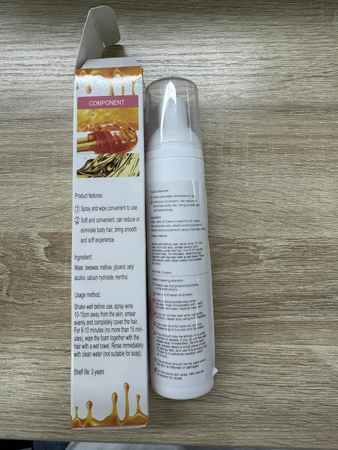 Experience effortless and painless hair removal with Gentle Beeswax Hair Removal Mousse. Suitable for face, arms, legs, and more, it delivers long-lasting smoothness. Enriched with beeswax, maltose, and glycerin, it deeply moisturizes and improves skin texture. Easy to apply and rinse, simply spread, wait 5-10 minutes, and gently scrape off. Includes 2 bottles 100ml, for yourself or to share with friends. Specification: Product Name: Beeswax Hair Removal Mousse Net Weight: 100ml/3.4floz Shelf Life: 3 years Storage Method: Store in a cool, dry place. Package Includes: 2 Pcs * Beeswax Hair Removal Mousse How to Use: Step 1: Shake the bottle and press the nozzle. Step 2: Spray evenly across the area and leave it on for 5-10 minutes. Step 3: To check if hairs are already detached, gently test a small area. Completely wipe it clean if hair already starts falling off.