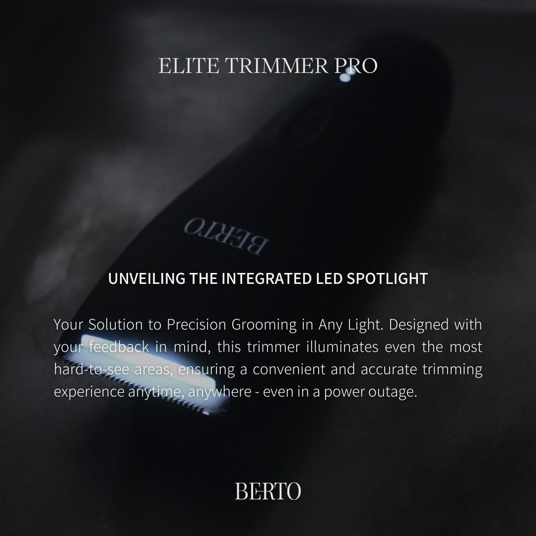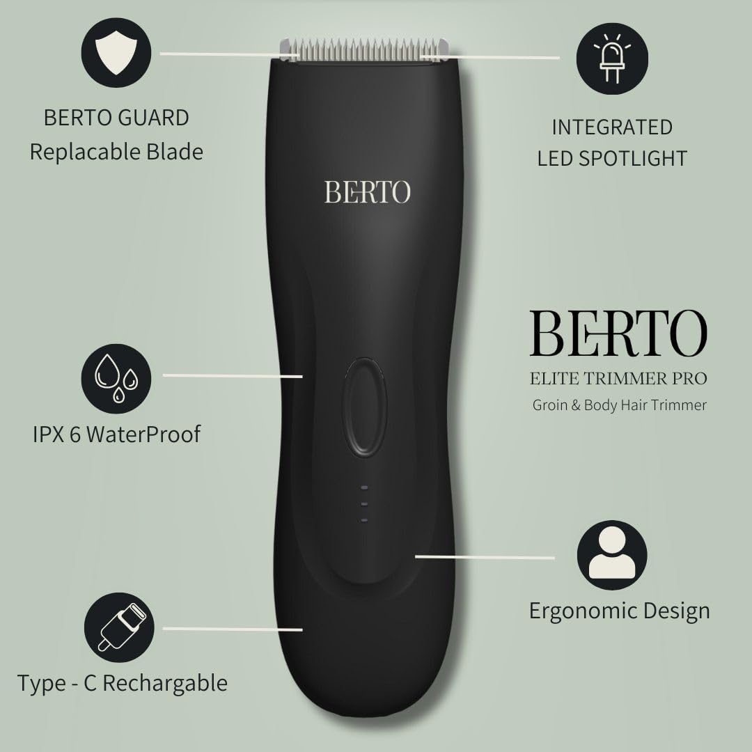 BERTO Elite Trimmer PRO, The Best Ball Trimmer for Men, Pubic Hair Trimmer, Electric Groin Hair Trimmer, Body Trimmer, LED Spotlight, IPX6 Waterproof for Wet/Dry Use, Replaceable Ceramic Blades