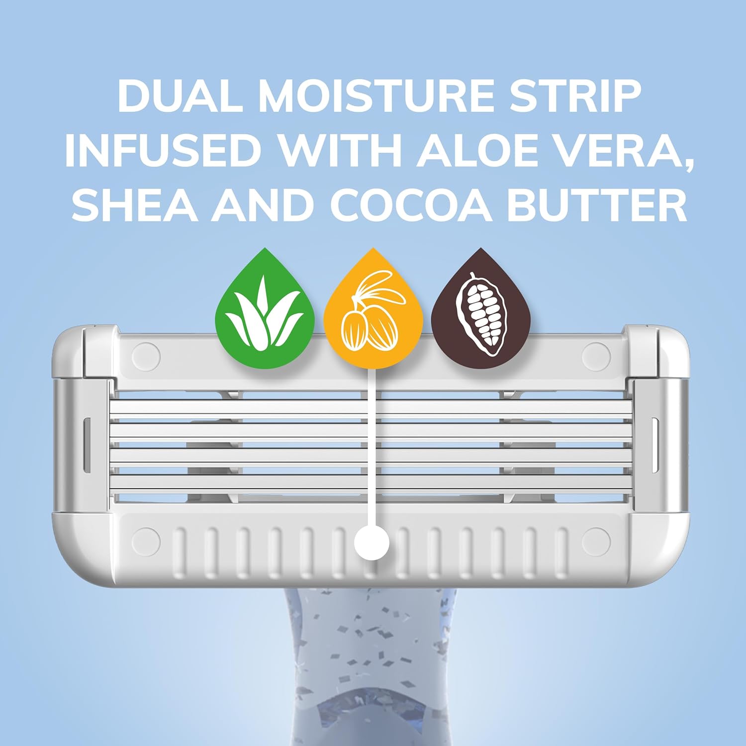 Shaving razors with four longer-lasting* blades for a close and comfortable shave, plus dual moisture strips infused with aloe vera, shea and cocoa butter *Vs. BIC Sensitive