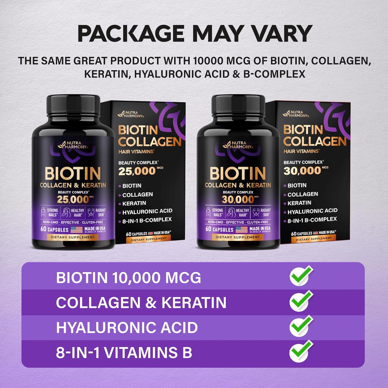 Biotin with Hyaluronic Acid & Collagen Supplement — The Nutraharmony biotin supplement contains potent Biotin, Collagen, Keratin, and other essential nutrients that naturally support your health and beauty. Take two capsules a day with our highly bioavailable formula that promotes fast and proper absorption. Take care of your skin.