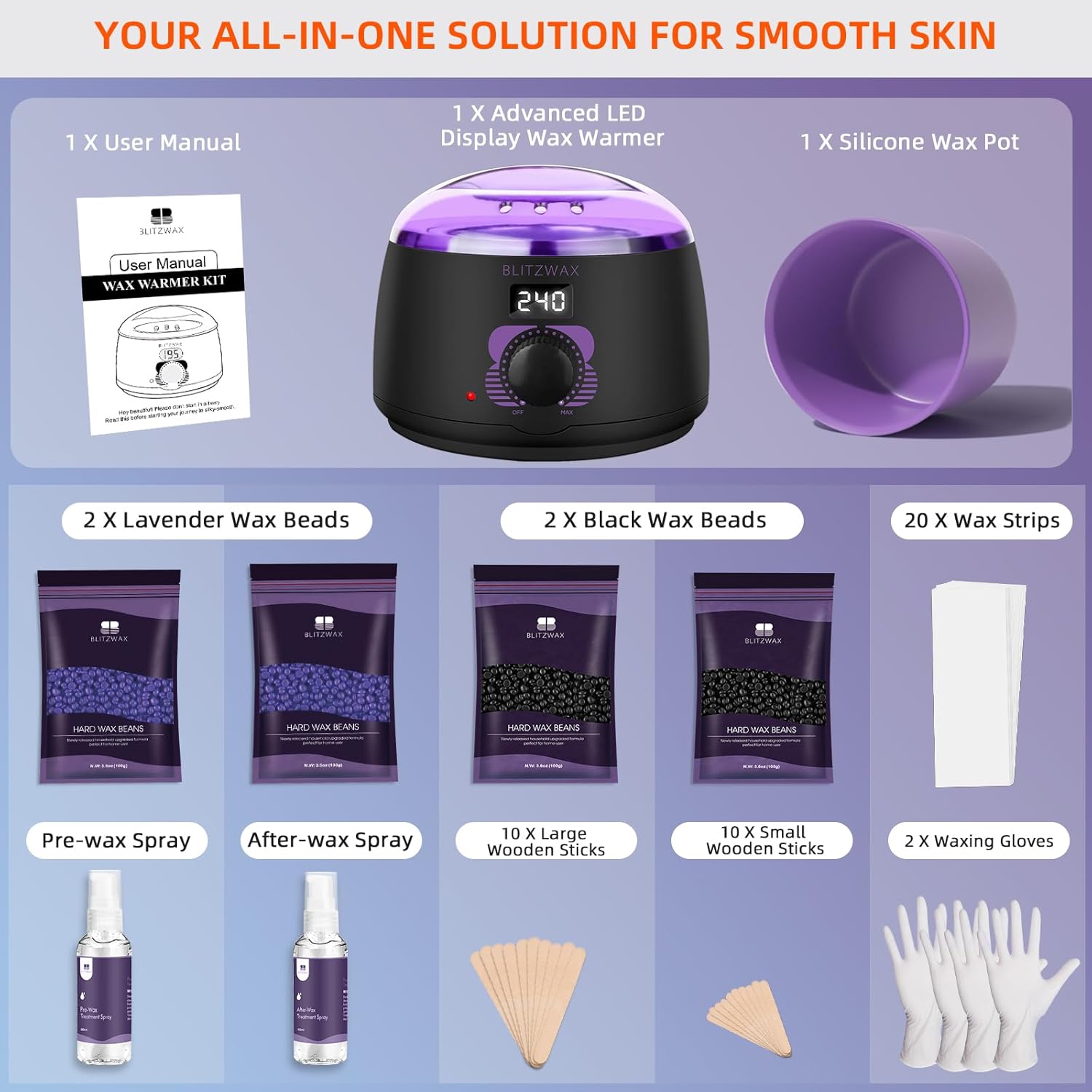 BLITZWAX Waxing Kit for Women Men Digital Wax Kit Suitable for Sensitive Skin/Brazilian/Full Body/Bikini/Hair Removal Hard Wax Kit with 50 Wax Items for Home, Bathroom