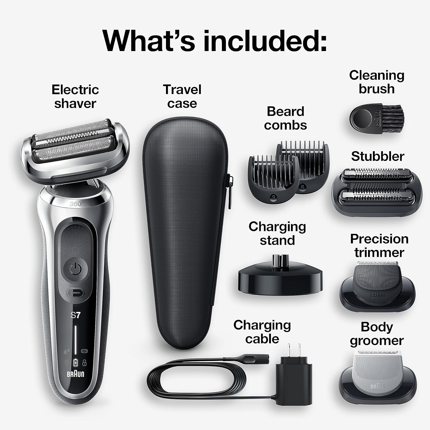 WHATS IN THE BOX: Series 7 electric razor; 5 additional trimmer attachments, travel case, charging stand, cleaning brush, charging cord, and user manual