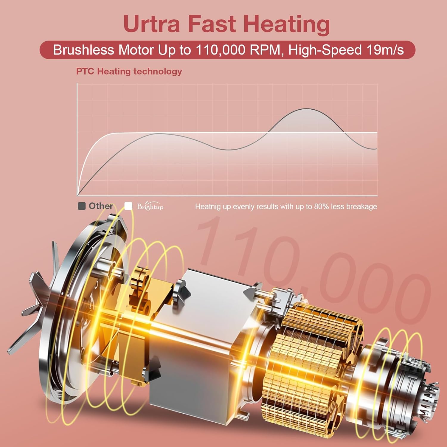 [Professional High-Speed Brushless Motor] This high-speed motor up to 110,000 RPM, generates high-velocity and powerful airflow up to 19m/s, 6 times the airflow powerful than an ordinary styling tool, which allows the hair dryer to dry ultra-fast while maintaining low heat, ensuring fewer frizz, and keeping your hair smooth and shiny. Reduce your styling time in half for ultra-fast drying with no heat damage—innovation for a remarkable styling experience.