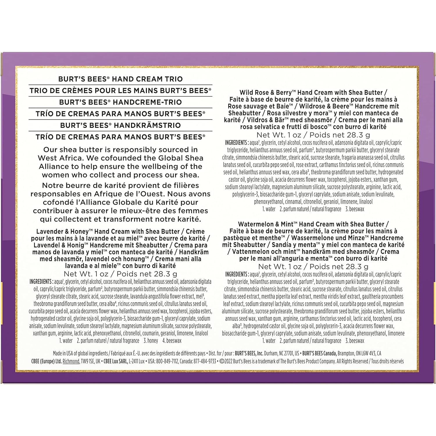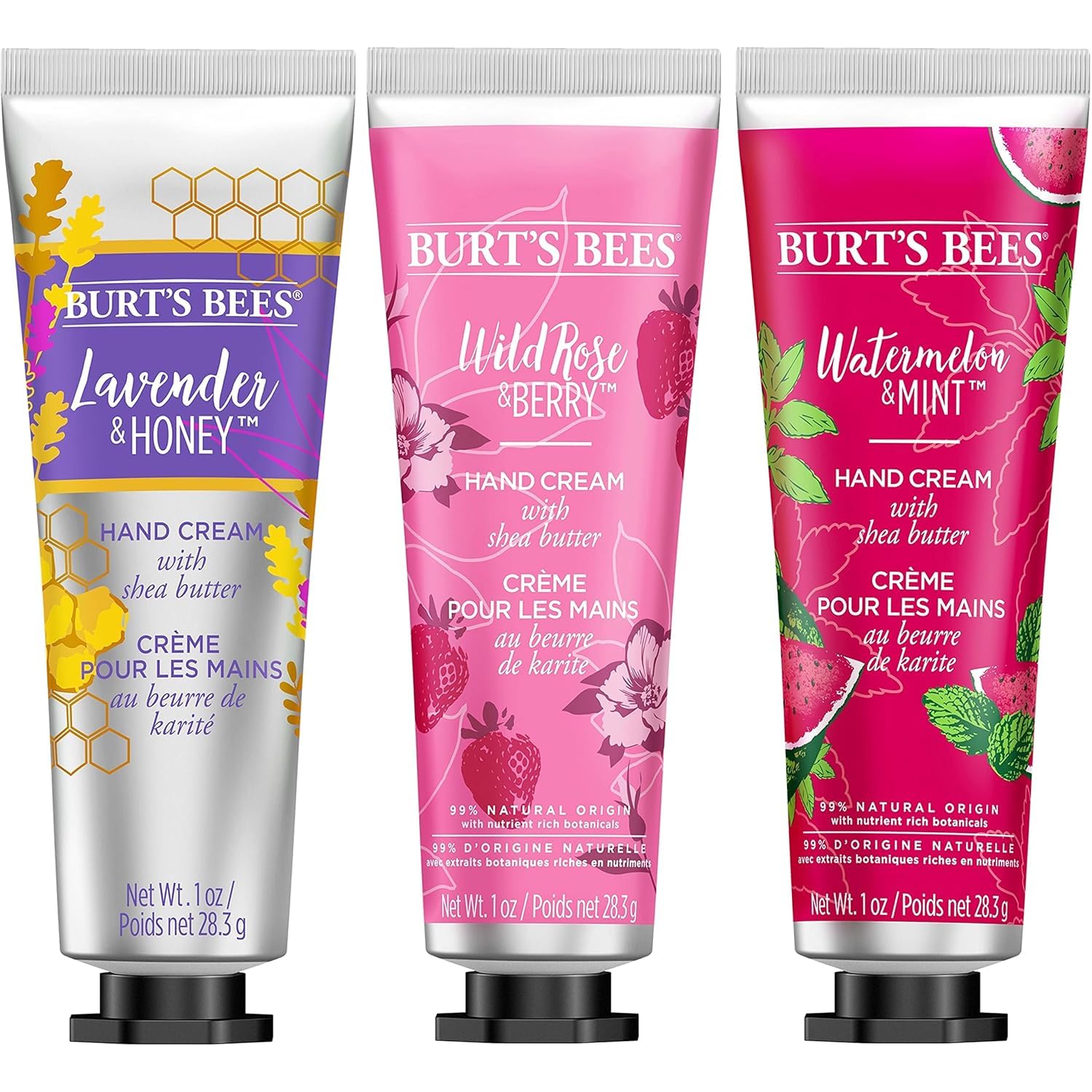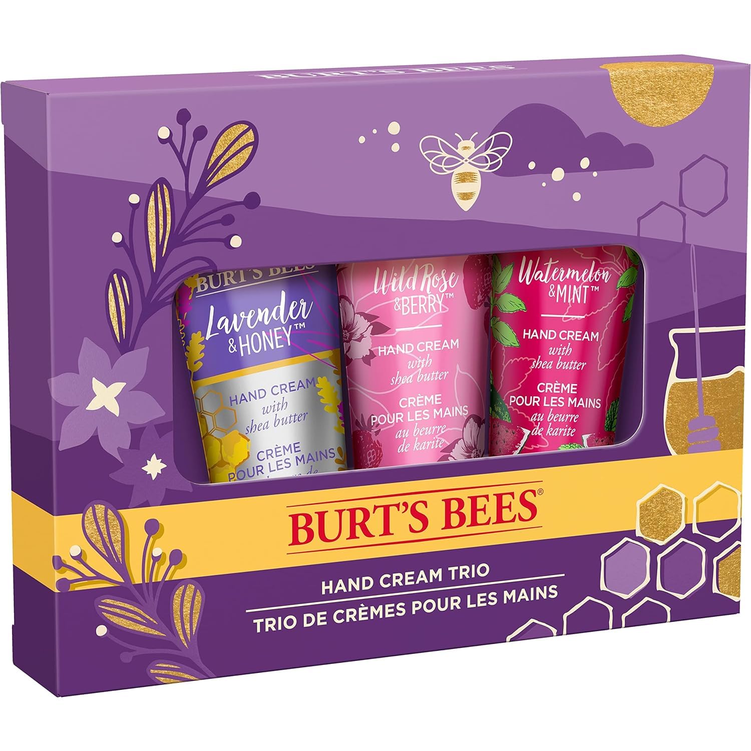 PACKAGE CONTENT: One package of the Burt’s Bees Hand Cream Trio contains three 1 oz bottles of Watermelon and Mint, Lavender and Honey, and Wild Rose and Berry hand lotion with holiday-theme packaging