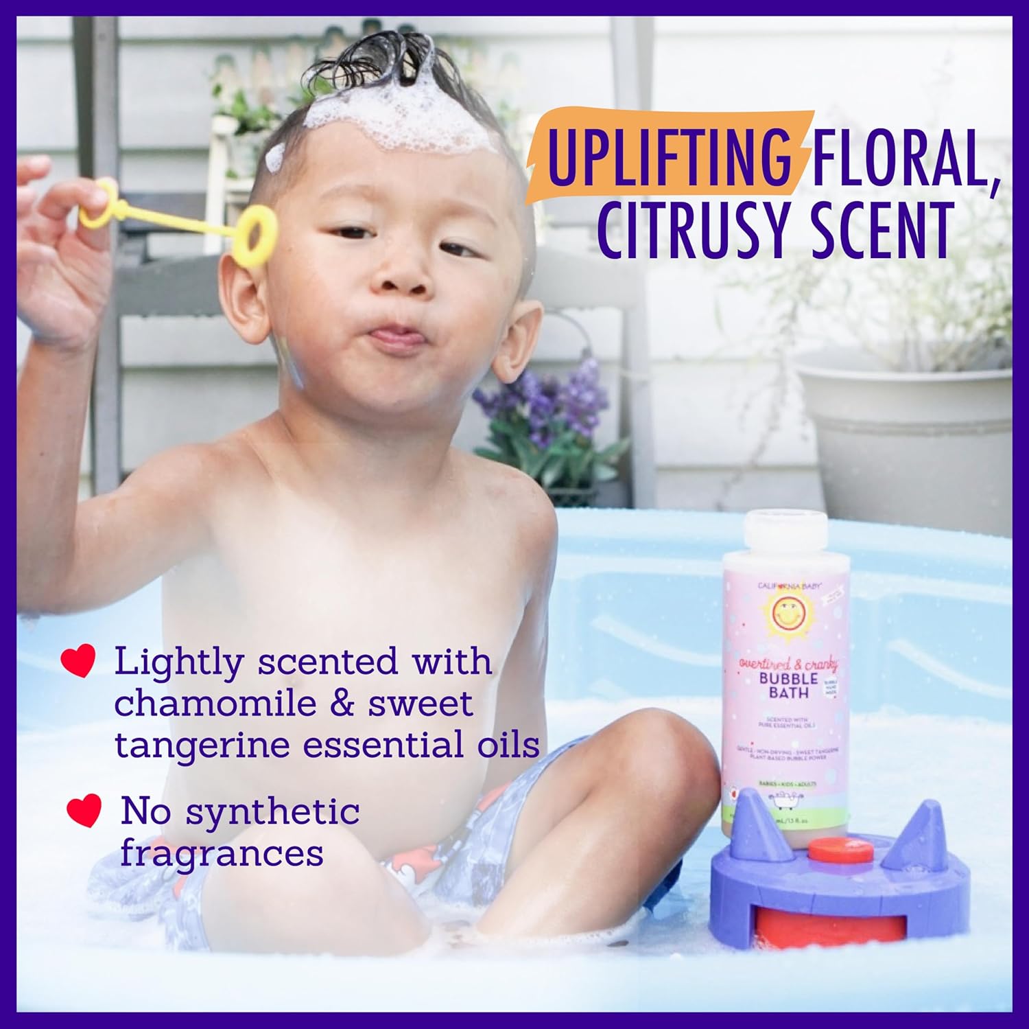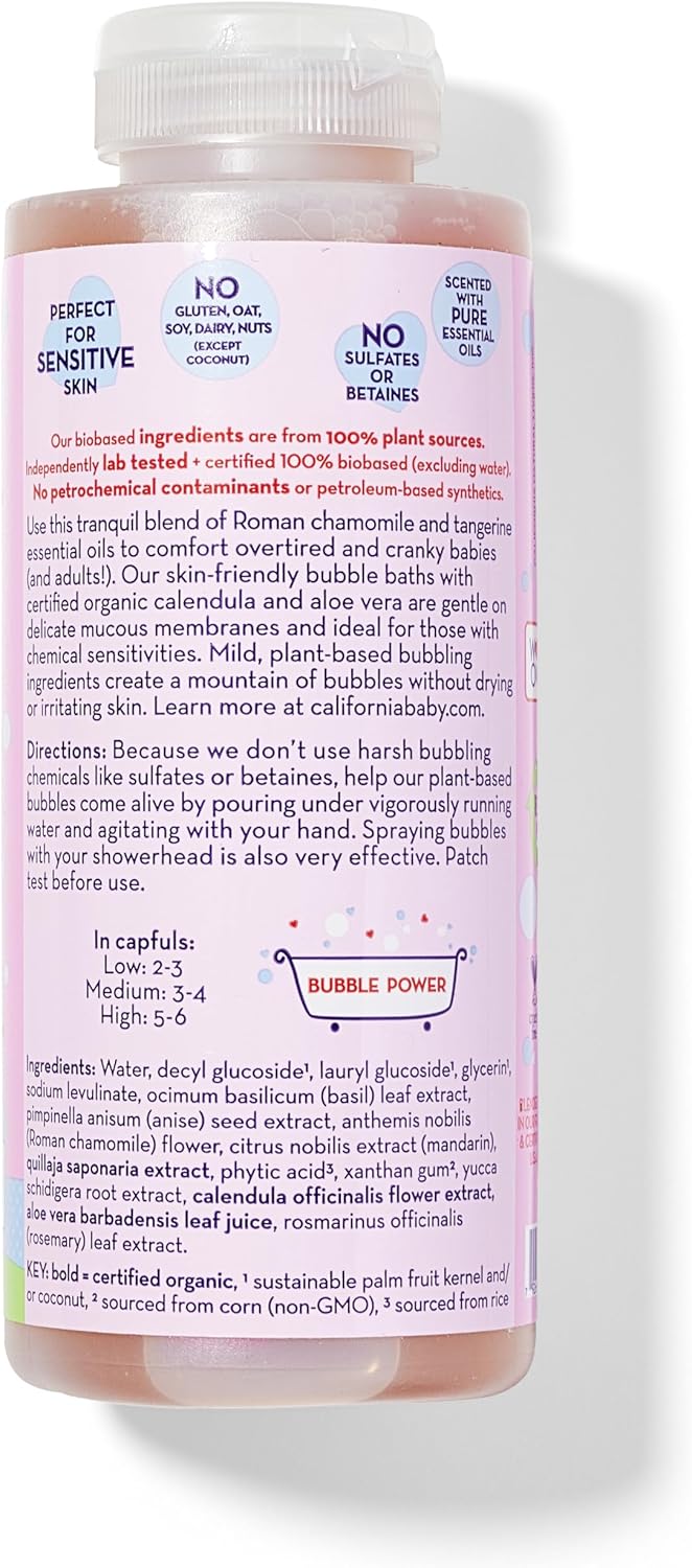 BEAUTIFUL LIGHT, FLORAL SCENT: California Baby Overtired Cranky bubble bath is lightly scented with a comforting, uplifting blend of Roman chamomile and sweet tangerine essential oils that are tested pesticide free.