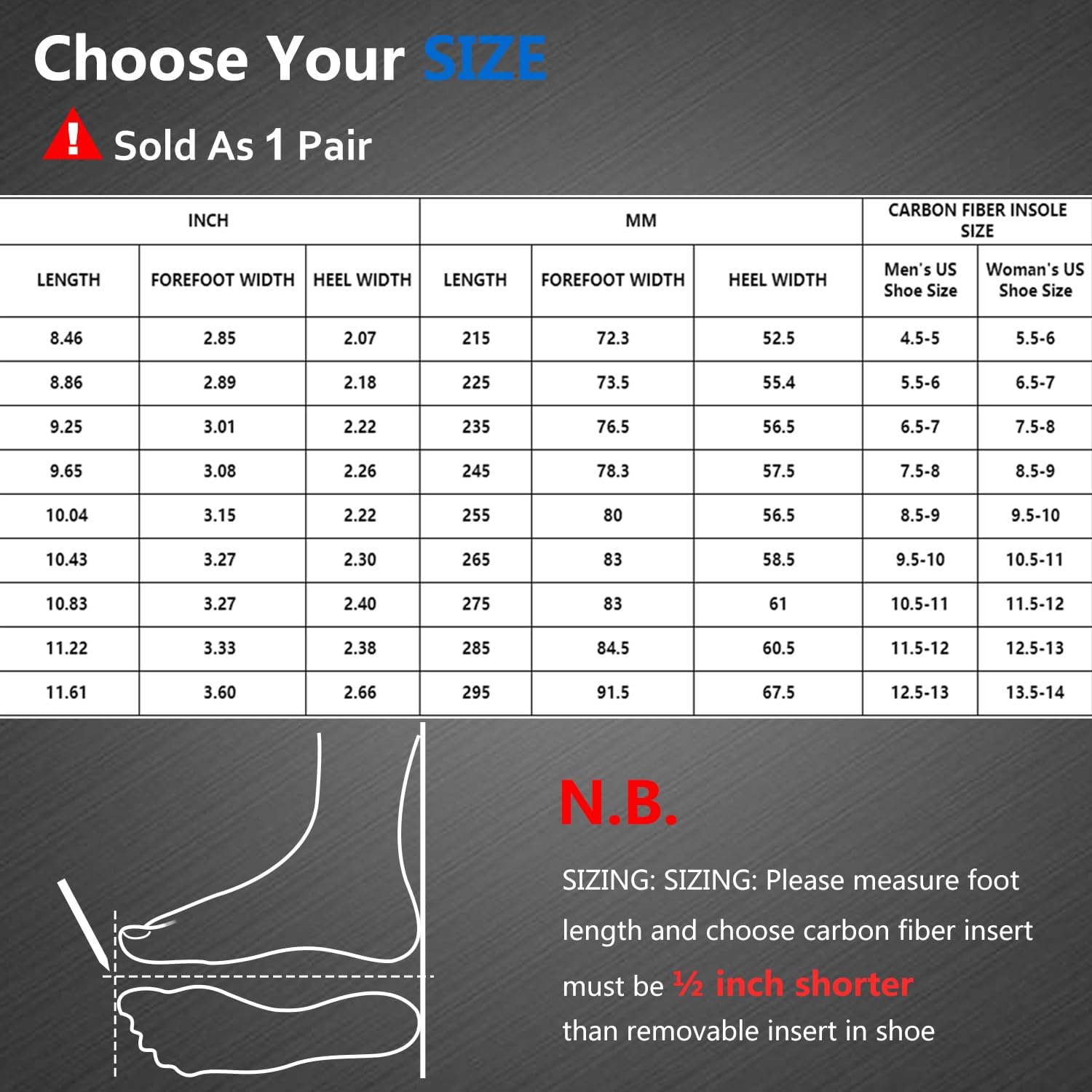 【SOLD AS 1 PAIR】The carbon fiber shoe insert works for either foot. To make sure you order the right size carbon insole please measure your feet insoles. They are suitable for sports and sneakers shoes,not for high heels or dress shoes. Alternative to postoperative shoes. Note: For more comfort, please put the carbon fiber insoles for men under the original insoles