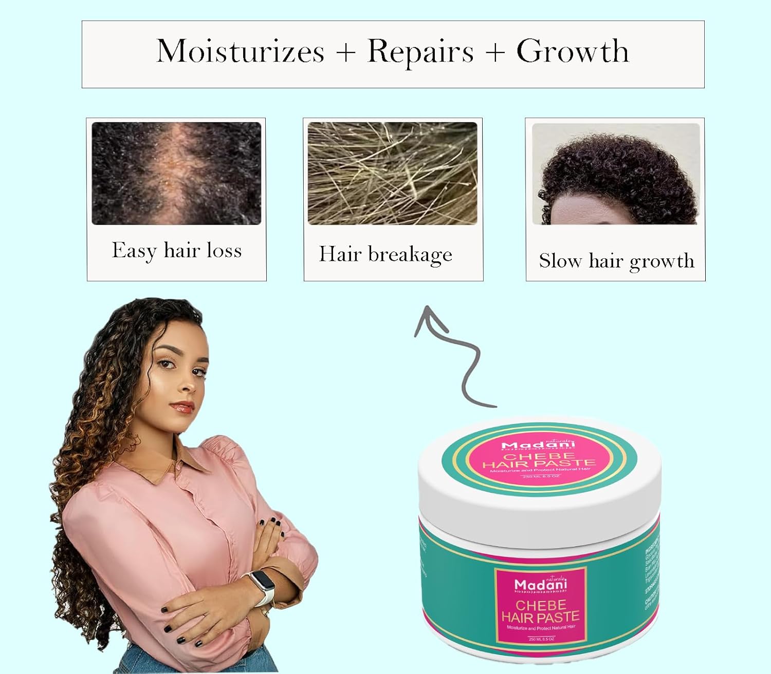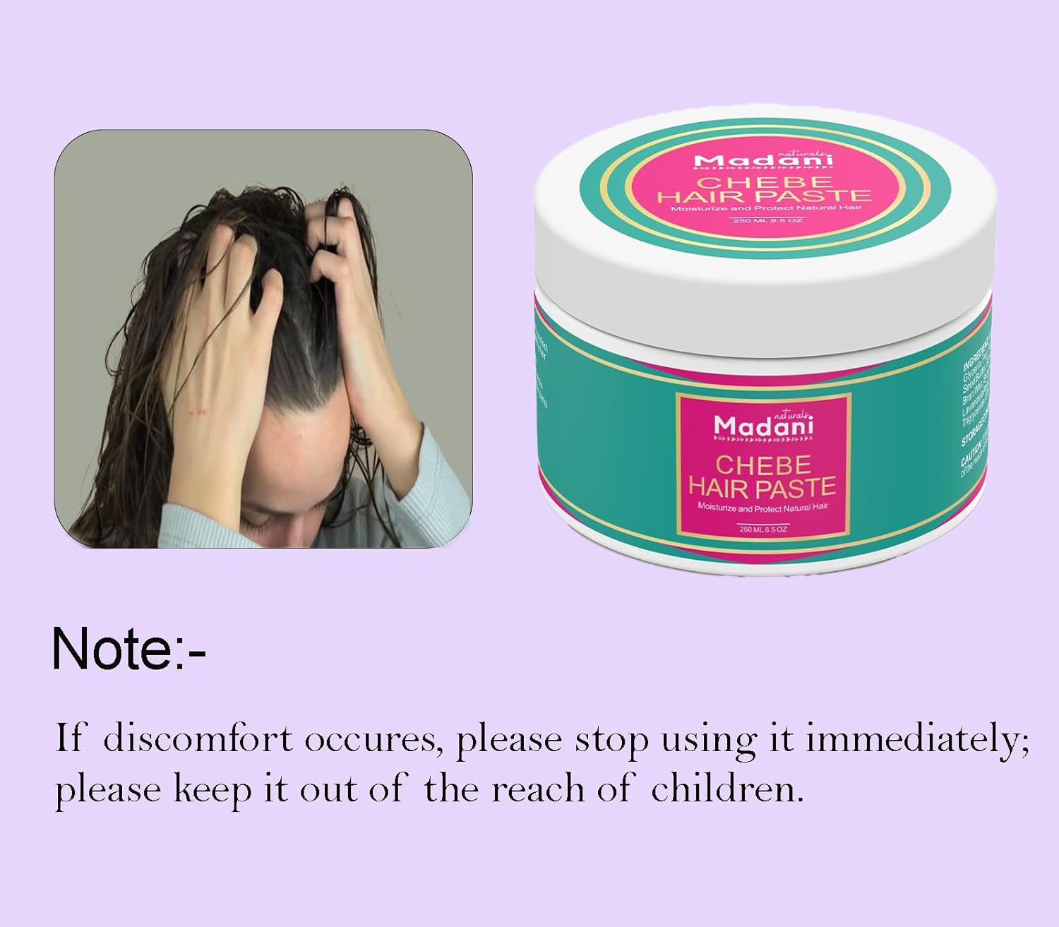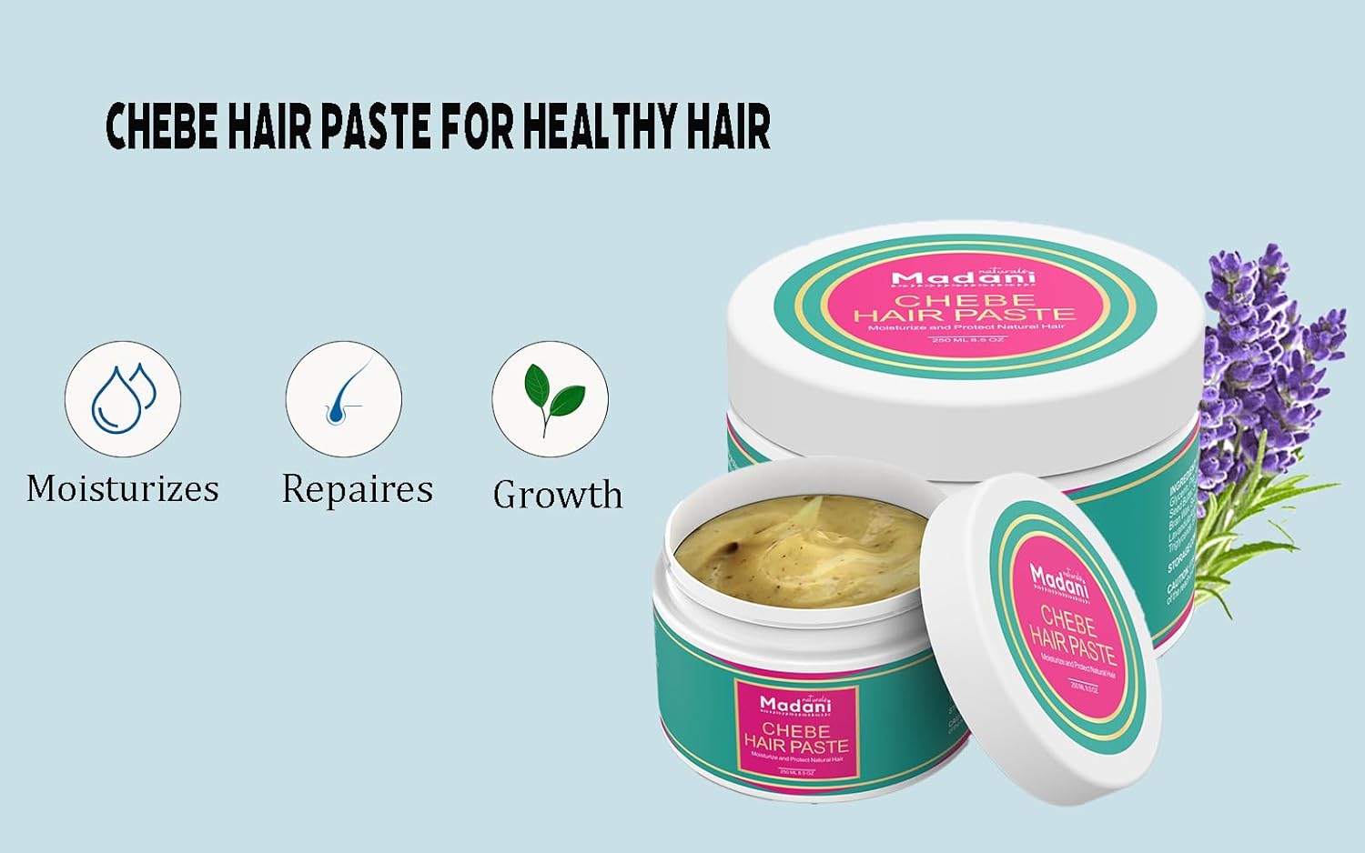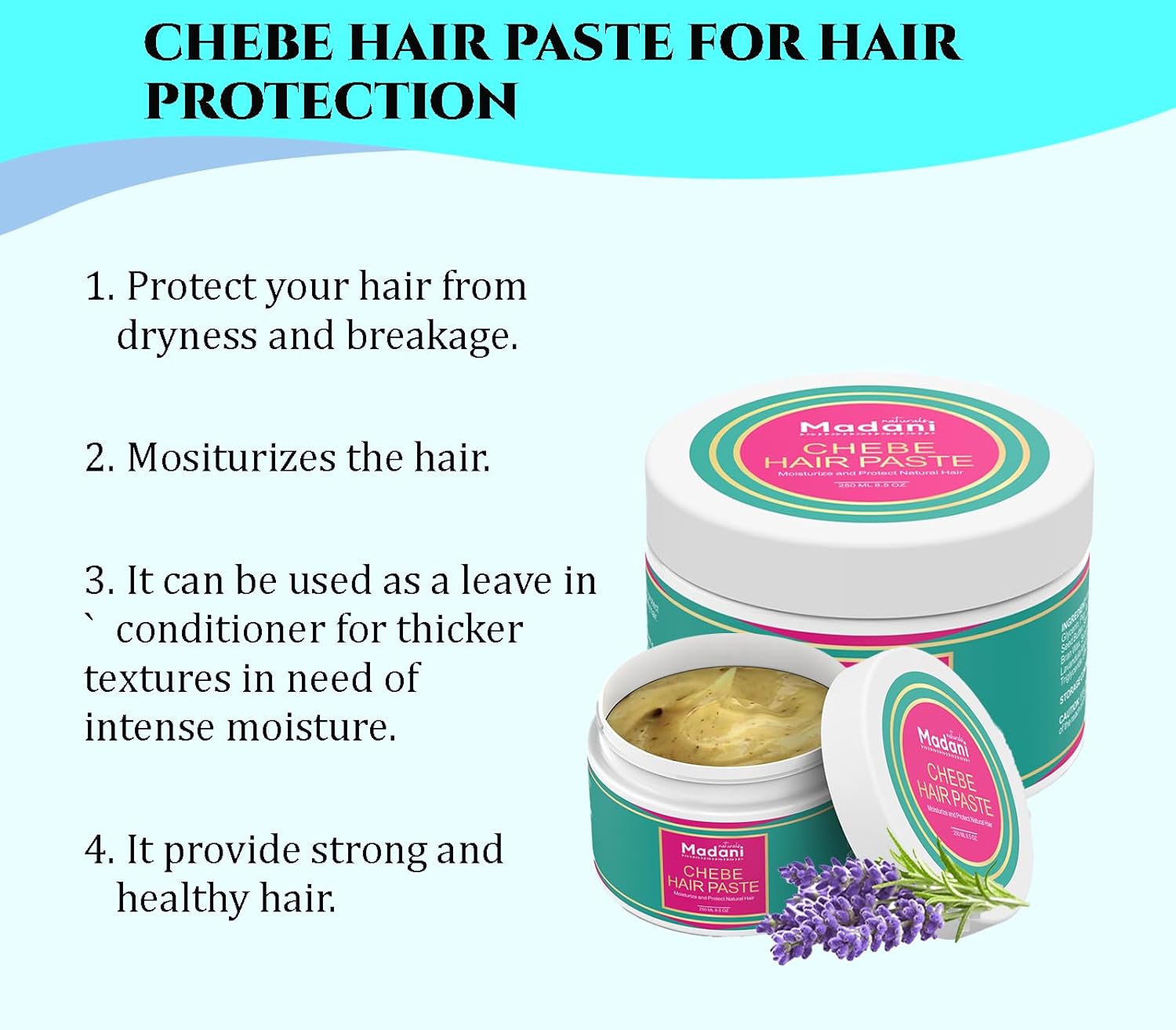 Moisturizing and Nourishing: The Madani Chebe Hair Paste moisturizes to protect your hair from dryness and breakage so you can enjoy strong healthy hair. The rich and creamy texture of our hair paste provides intense hydration to your hair and scalp, leaving it soft, silky and manageable.