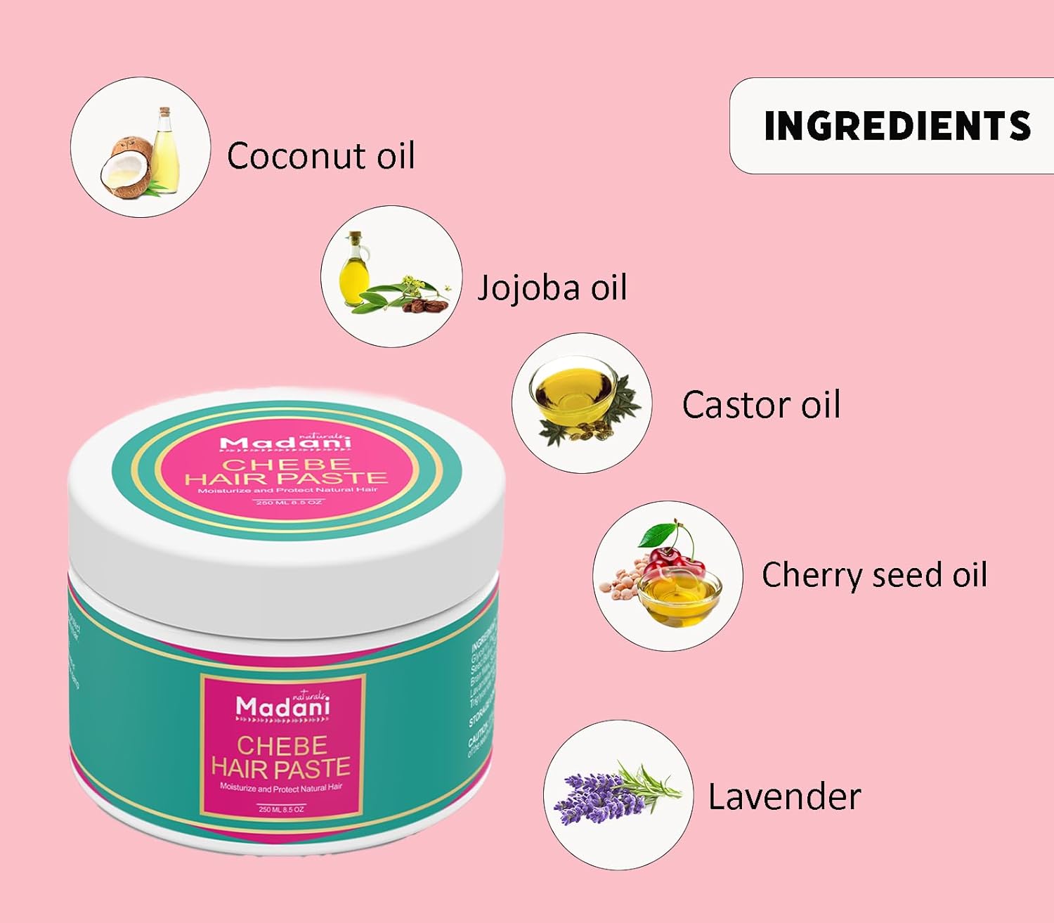 100% Natural, Organic & Vegan: Infused with the finest ingredients such as Chebe Powder, Lavender Oil, Coconut Oil, Castor Oil, Cacao Seed Butter, Biotin, Cloves, Rice Bran Wax, Sweet Cherry Seed Oil, Jojoba Oil. Madani Naturals hair paste is the perfect choice for nourishing your hair and scalp.