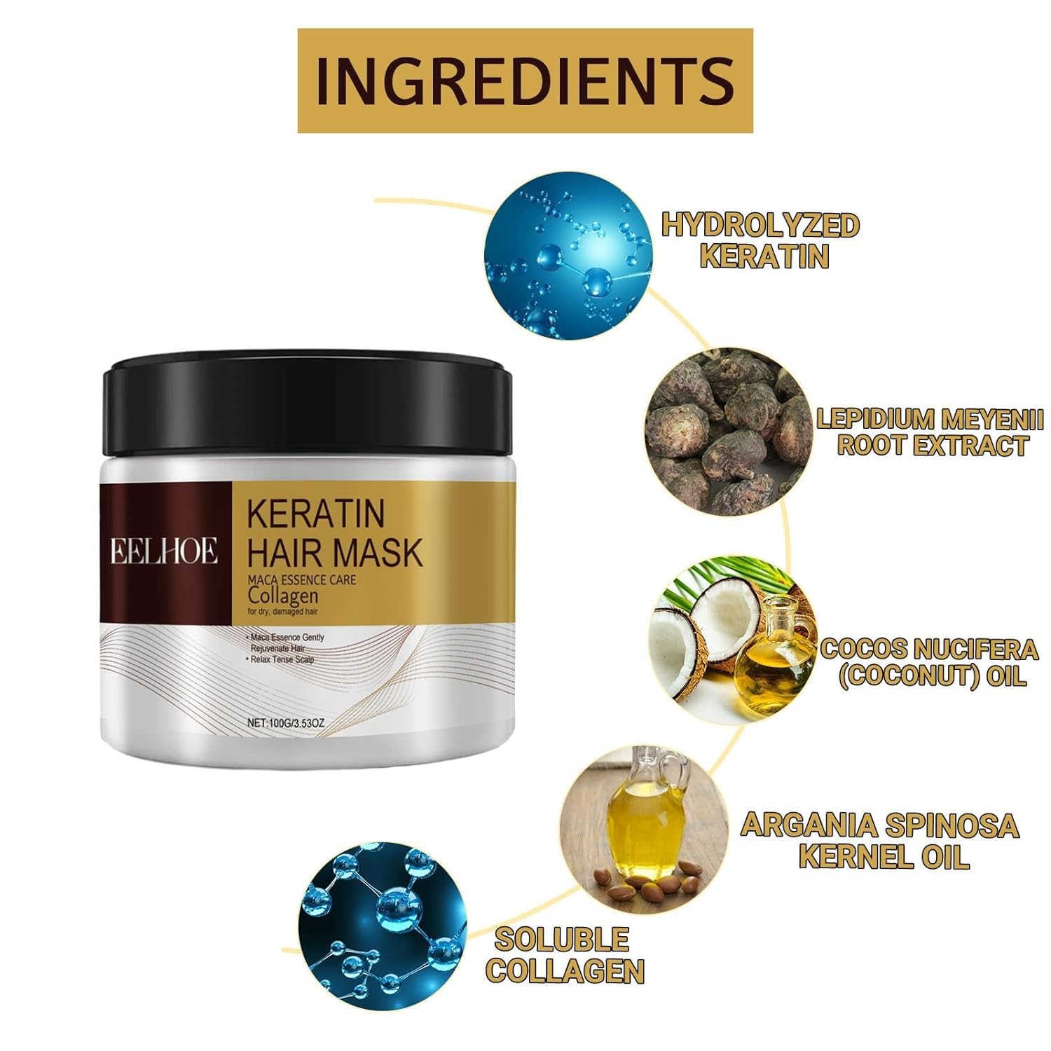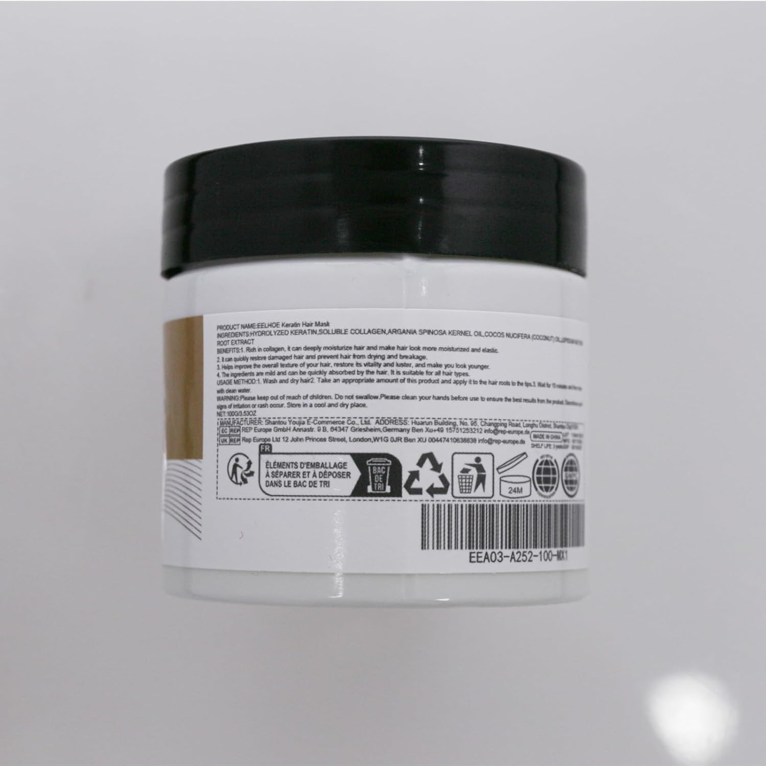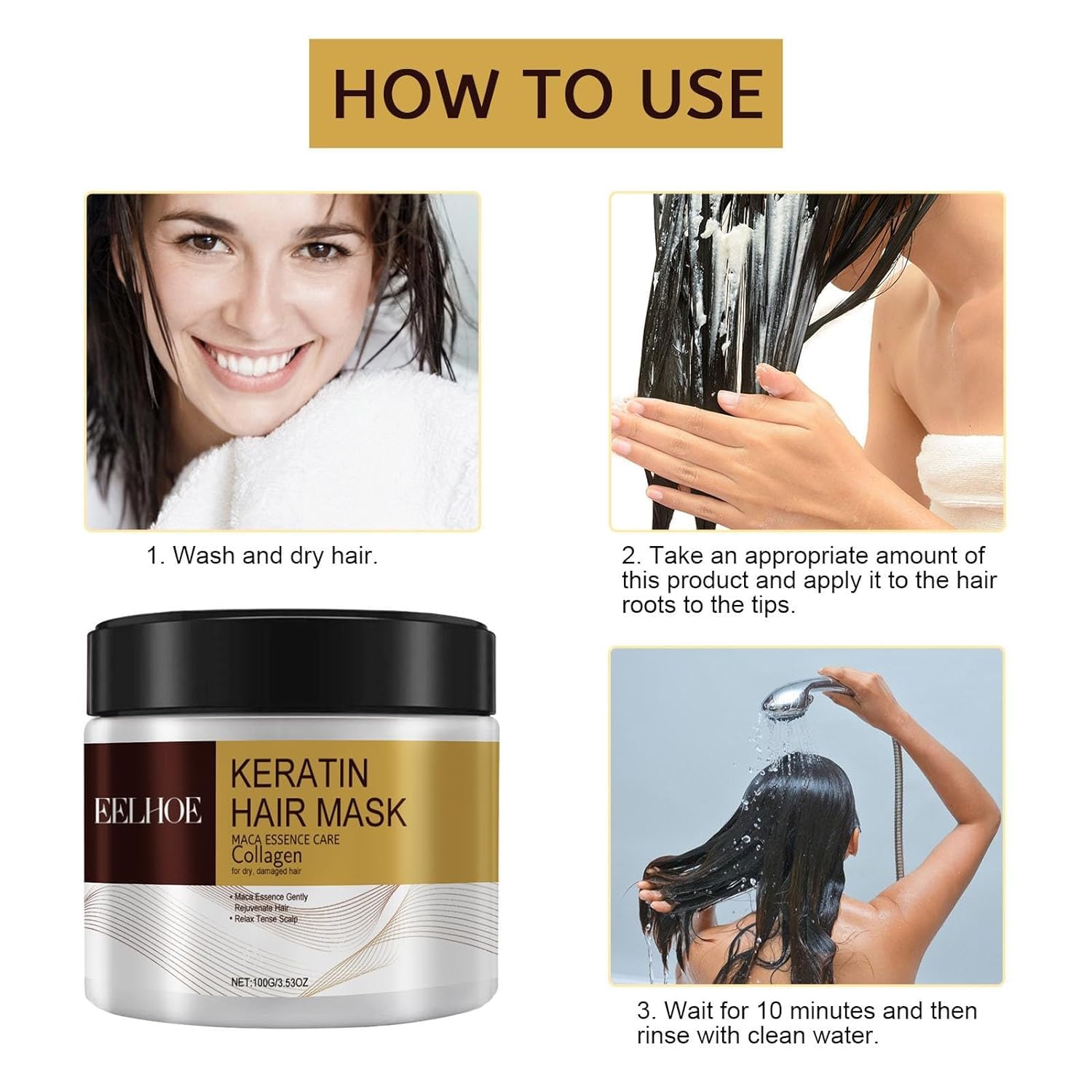 【Ingredients】This repairing and nourishing hair mask contains keratin, collagen, argan oil, coconut oil, maca extract and natural herbs to deeply repair dry and damaged hair.