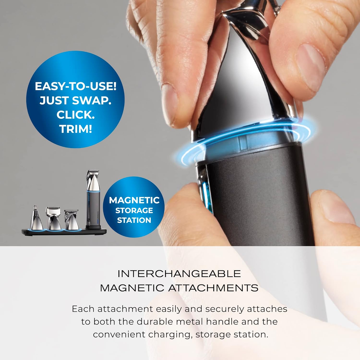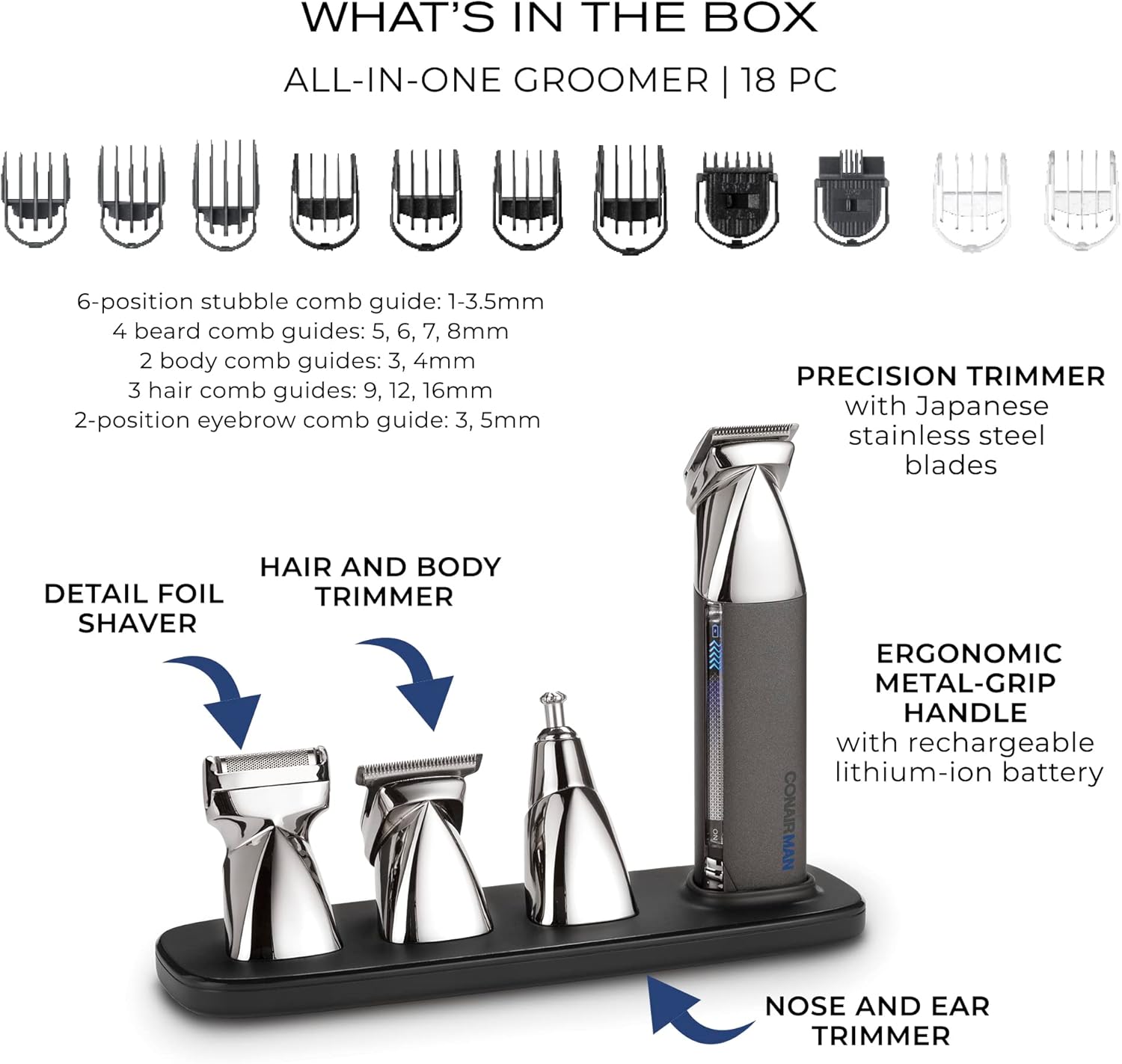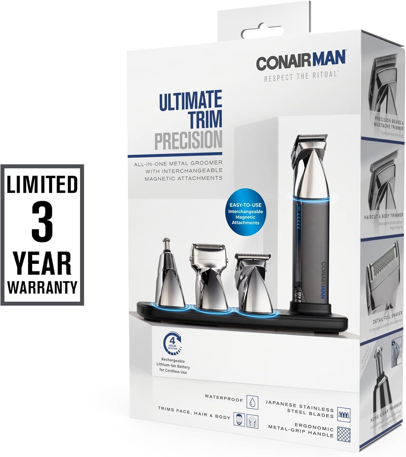 Men’s All-in-1 Groomer with Stainless Steel Blades and Attachments: Precision head-to-toe trimming and grooming are easy with the Ultimate Trim Precision 18-Piece All-in-One Metal Groomer by ConairMan. Four interchangeable magnetic attachments click onto the professional-grade metal handle with a secure hold that lets you go from hair and body cuts to beard, mustache, nose, and ear trims.