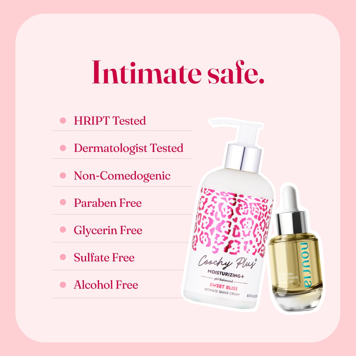 HRIPT Tested to be safe for all skin types. Hypoallergenic & noncomedogenic. Made in USA. NOURIA Pre-Shave Elixir Oil 1 fl oz, COOCHY PLUS Intimate Shave Cream 8.5 fl oz bottle