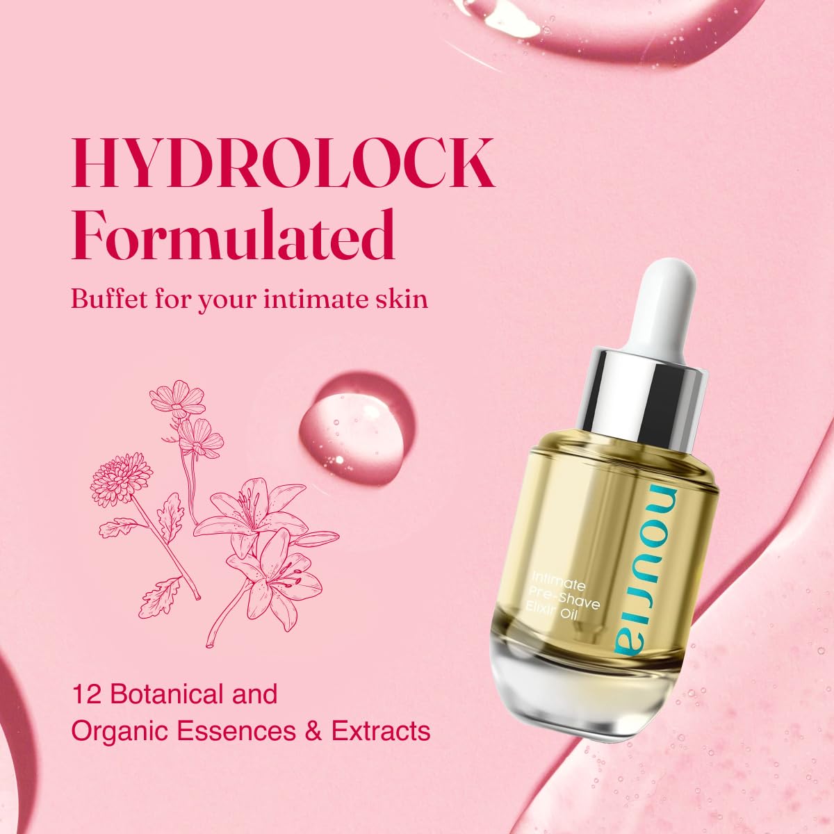 NOURIA Pre-Shave Elixir Oil contains HydroLock, a complex of plant-derived natural oils that are rich in deep-hydrating and long-lasting moisturization properties, further fortifies your intimate skin for maximum moisture retention and prevents moisture loss. Nourishing areas normally forgotten or unnoticed.