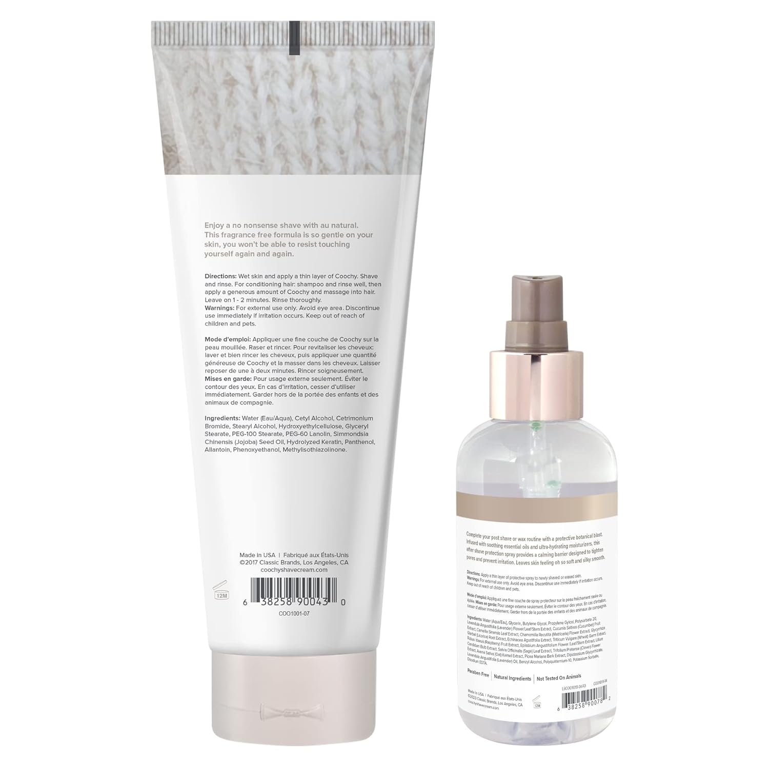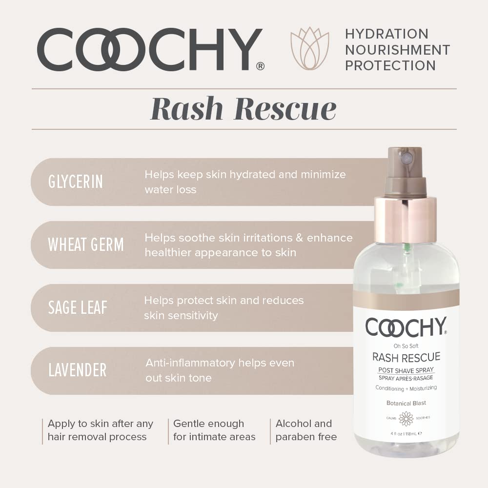 Au Natural Shave Cream 7.2 oz and Rash Rescue After Shave Protection Mist: Enjoy a no nonsense shave with au natural. This fragrance free formula is so gentle on your skin, you won’t be able to resist touching yourself again and again. Our signature shave cream stops red bumps from appearing on your bikini area, underarms, legs, and anywhere else you shave. Leaves skin oh so smooth and irresistible to touch! After shaving with Coochy Shaving Cream, apply a thin layer of protection mist to the shaven skin. May be used daily for continuous protection. Suitable to use on your intimate/bikini area and armpits.