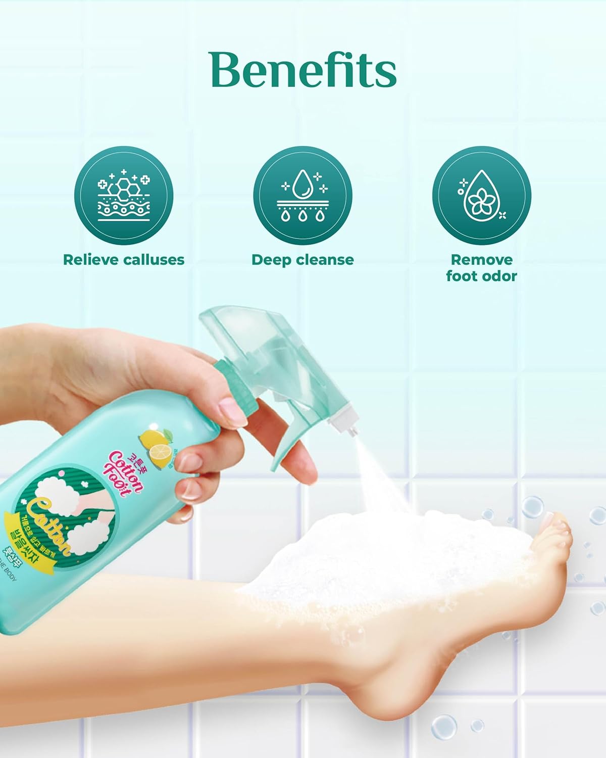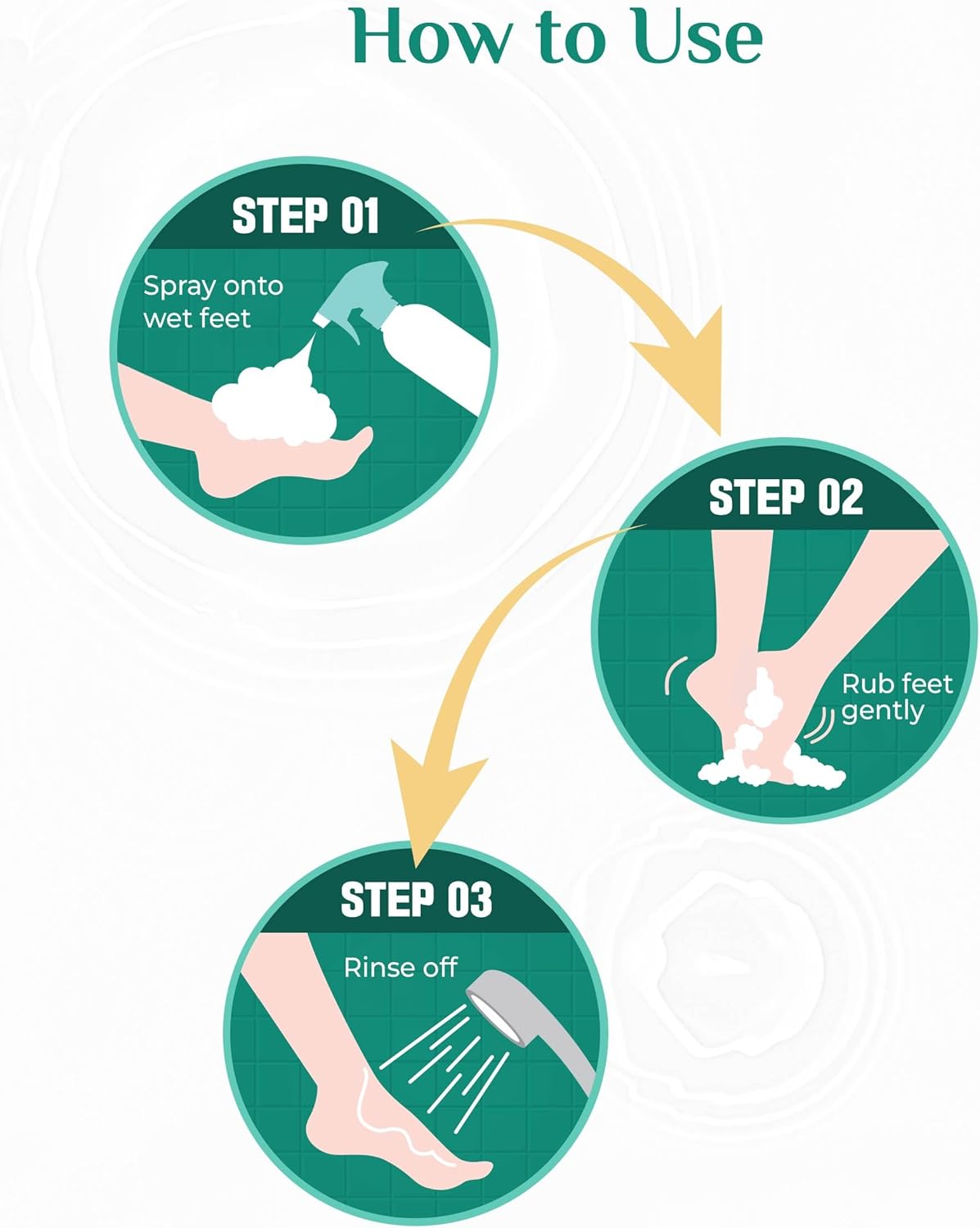 HOW TO USE – Spray directly onto feet during your shower routine, rub feet together to lather, and rinse thoroughly. No slip-ups—hold onto a support to ensure safety while washing.