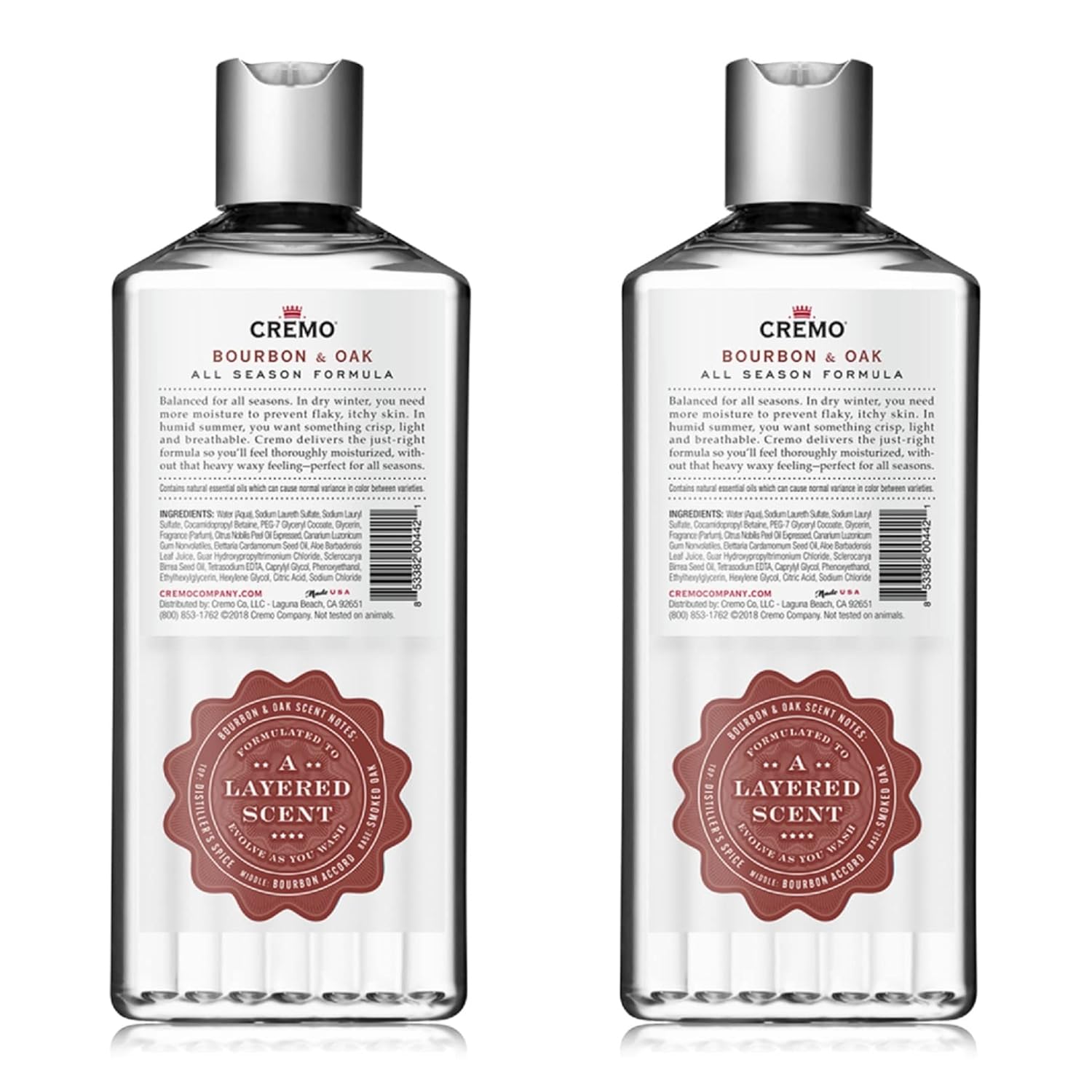 Cremo Rich-Lathering Bourbon & Oak Body Wash, A Sophisticated Blend of Distillers Spice, Fine Bourbon and White Oak, 16 Fl Oz (2-Pack)