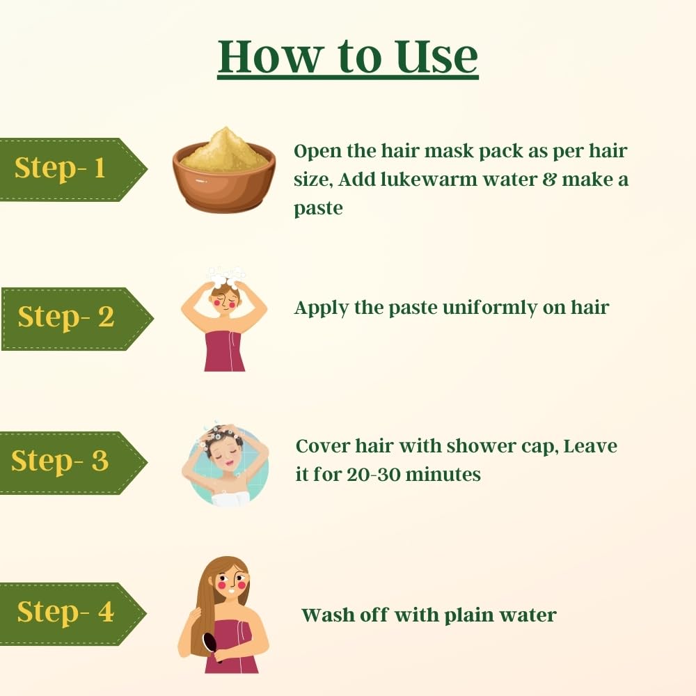 Ease Of Application: Experience effortless application of our hair mask. Simply mix the hair mask powder for men & women as per hair your length (1 sachet for small hair, 2 sachets for medium hair, 3 sachets for long hair and 4 sachets for extra long hair) with lukewarm water and stir to make creamy paste. Apply the paste uniformly on hair.Cover hair with shower cap. Leave for 15 to 30 min.Wash Off with plain water.
