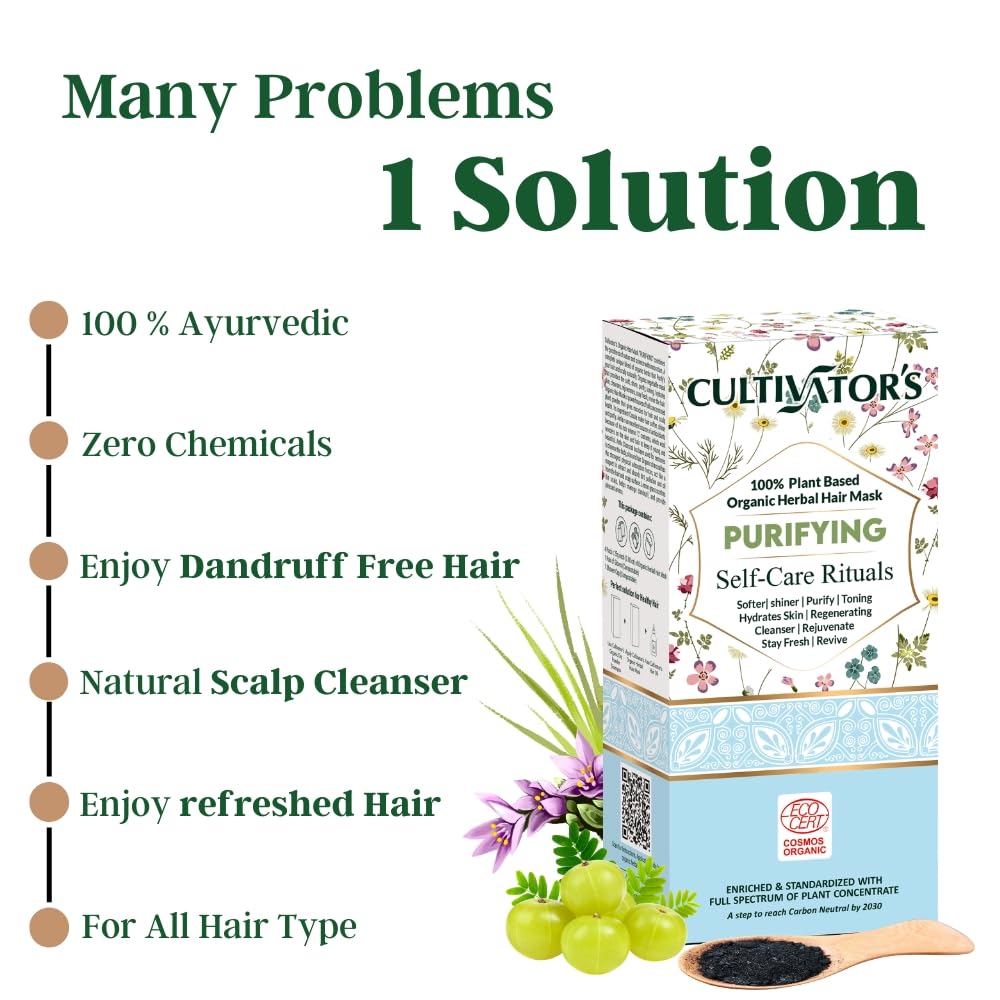 Say Hi to Organic Hair Mask: Cultivator’s Purifying Hair Mask is made using Cassia, Amla, Amla Charcoal, & lemongrass to control dandruff & cleanse your scalp. The goodness of Organic herbs helps remove oil & other impurities to provide a pure & healthy scalp. This vegetal hair mask works effectively on the scalp to give strength & nourishment to your hair. It is a powerhouse of fully concentrated plant powder that works like a miracle for hair & scalp health.♀️