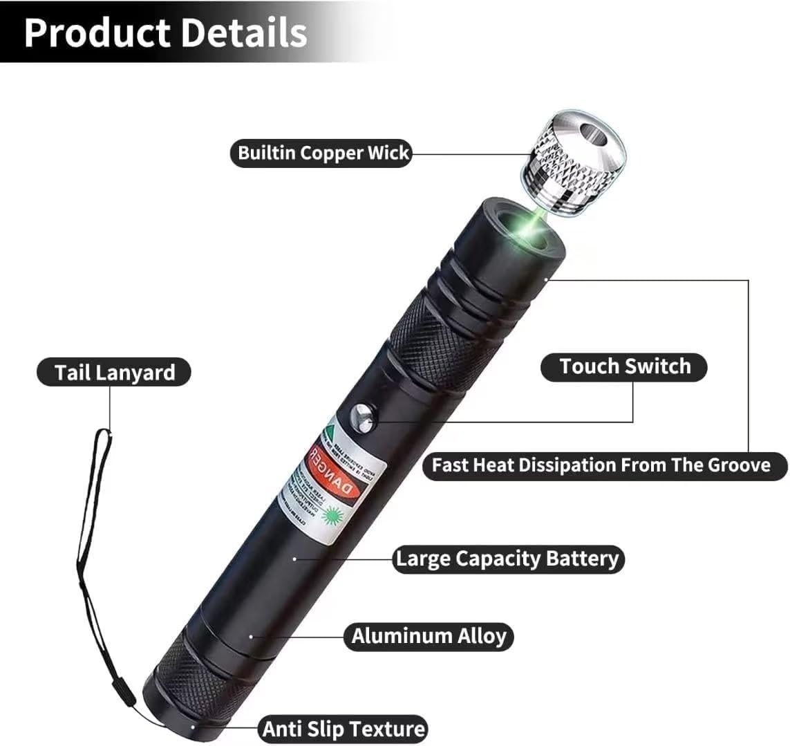 This high-powered laser pointer will not be easily deformed even when stepped on by an elephant, and it is made of high-quality aluminum alloy frosted case, which is comfortable in the hand and sturdy and durable. The carefully designed hand strap makes it easy to hold and carry.
