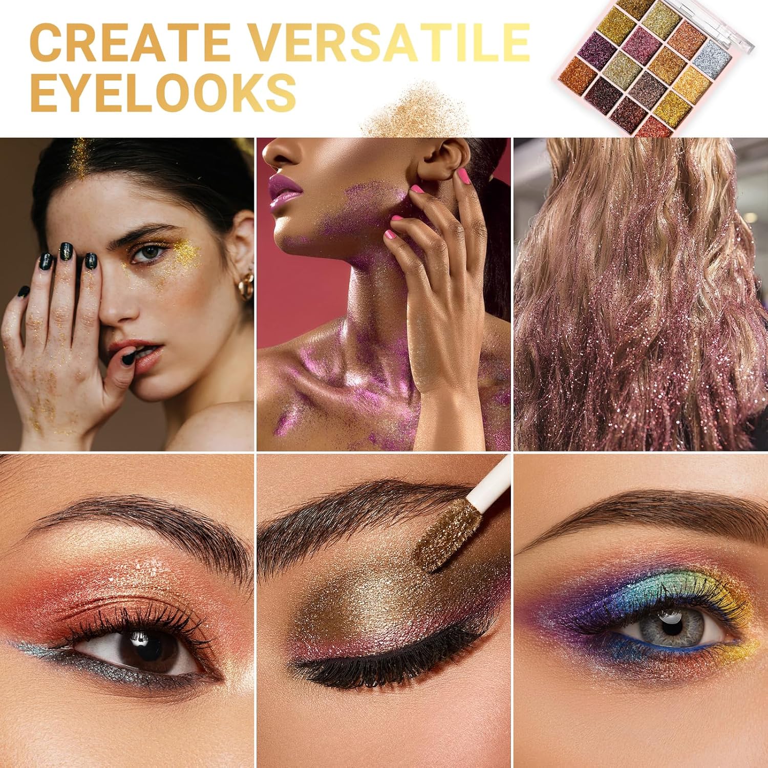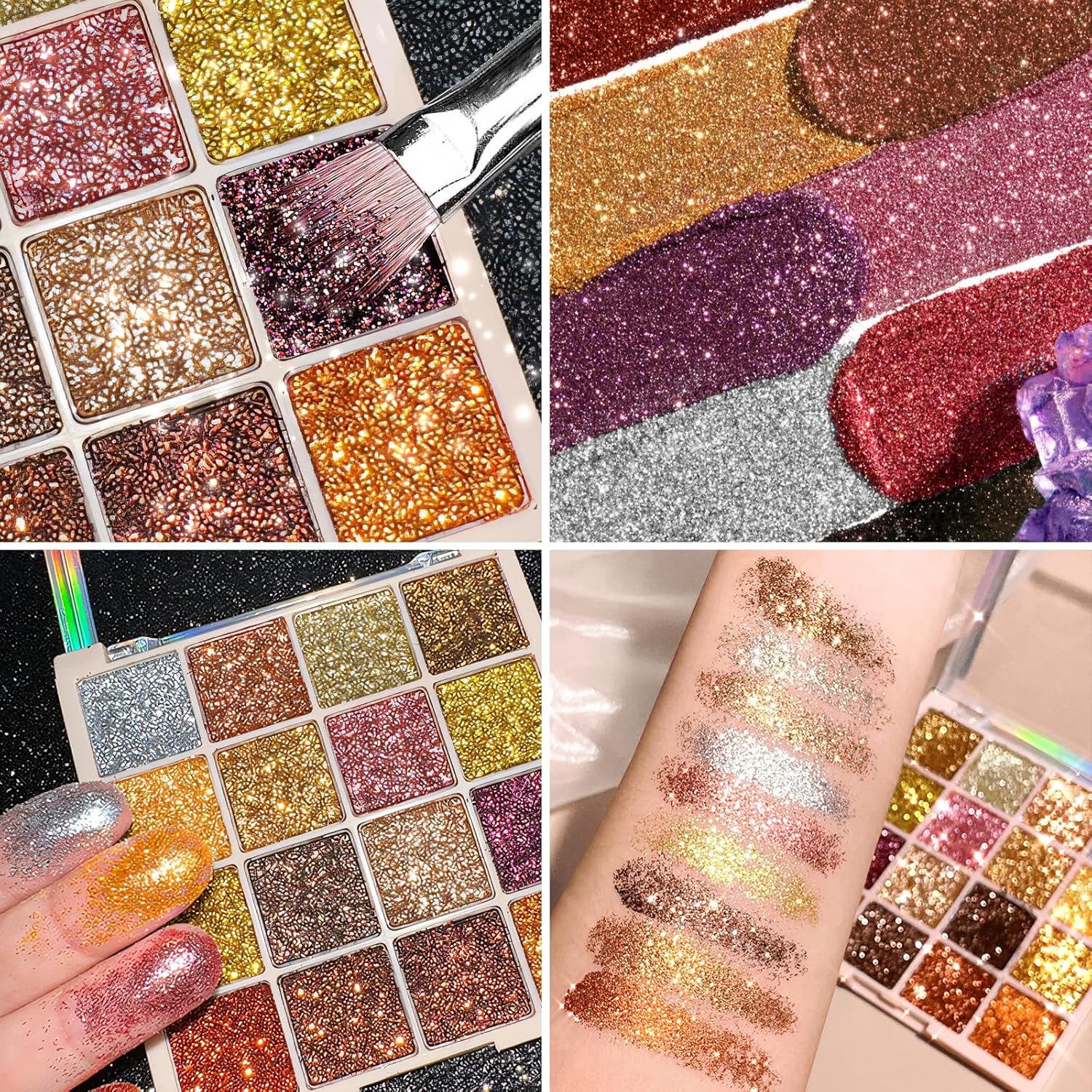 SPARKLE MAKEUP:The shimmer eyeshadow has a smooth texture and is easy to apply with amazing results.With gold as the main shade for a glittery look.There are also pink, purple and silver glitters to choose from, allowing the glitter eyeshadow palette to create even more creative looks.