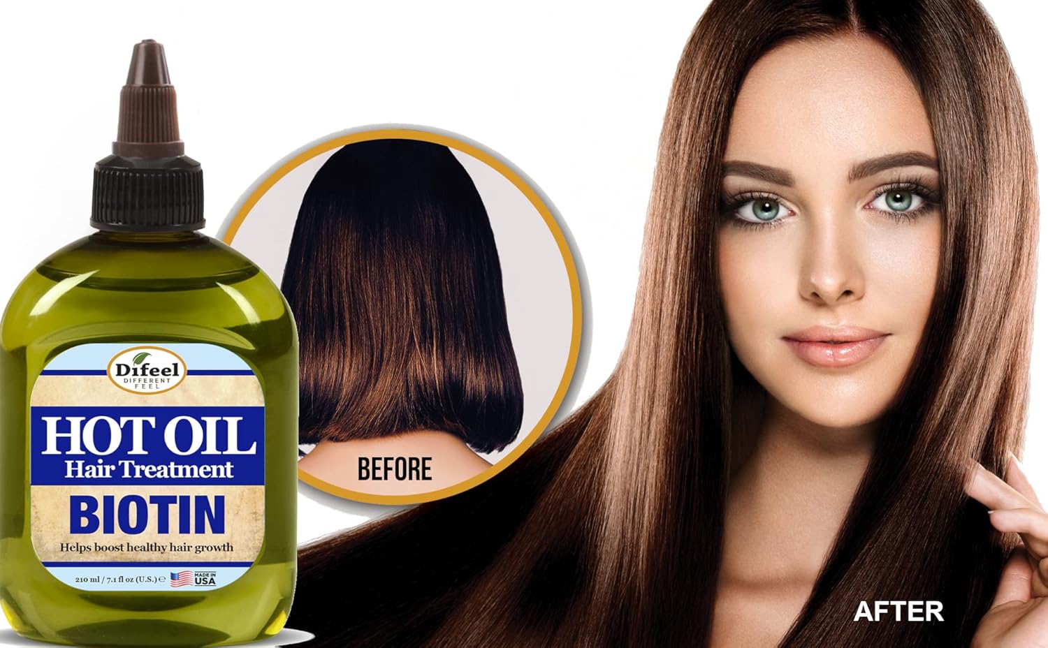 BIOTIN HOT OIL TREATMENT: Difeel Biotin Hot Oil Treatment for hair is a fortified, strengthening formula infused with Biotin, a water soluble vitamin that’s a part of the vitamin B family. A lack of Biotin can lead to hair loss.