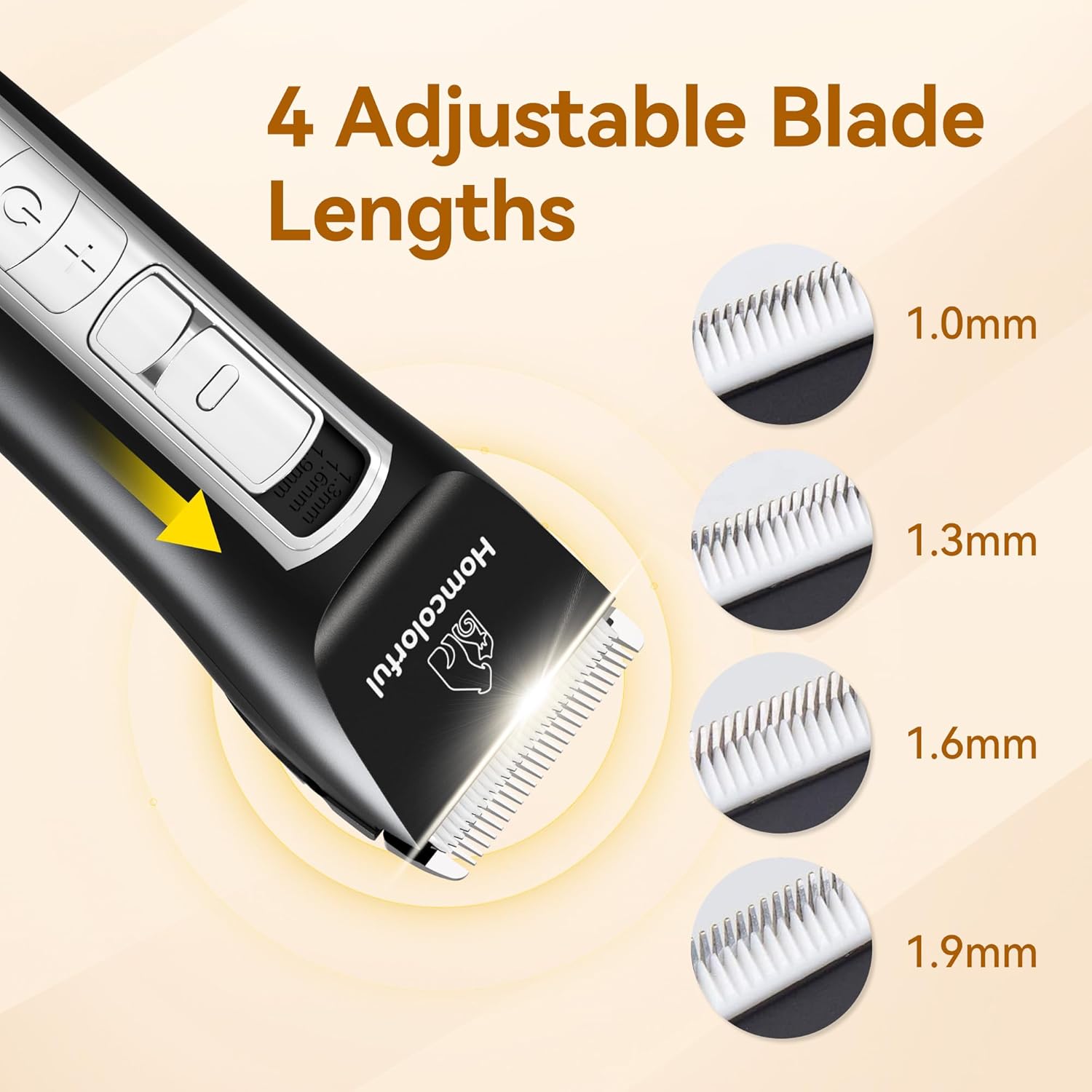 {Versatile Grooming Options} Homcolorful cat grooming kit includes 4 different guide combs (3/6/9/12mm) and blades lengths(1.0/1.3/1.6/1.9mm),which allow you to adjust different hair lengths for versatility.