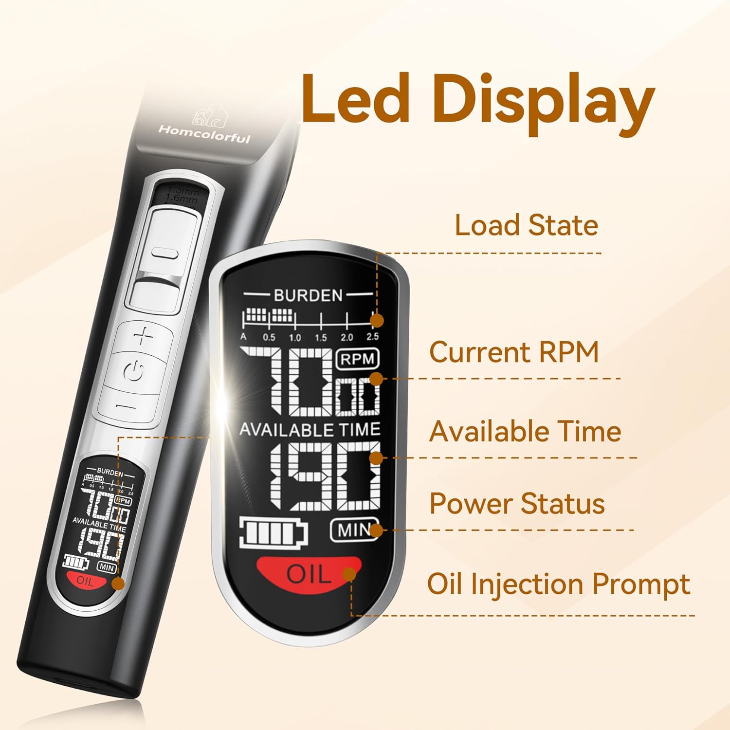 {LED Display} Equipped with an LED display screen, our cordless dog hair clippers set provides real-time information, including speed settings, battery status, remaining usage time, blade resistance values and blade oiling reminders.