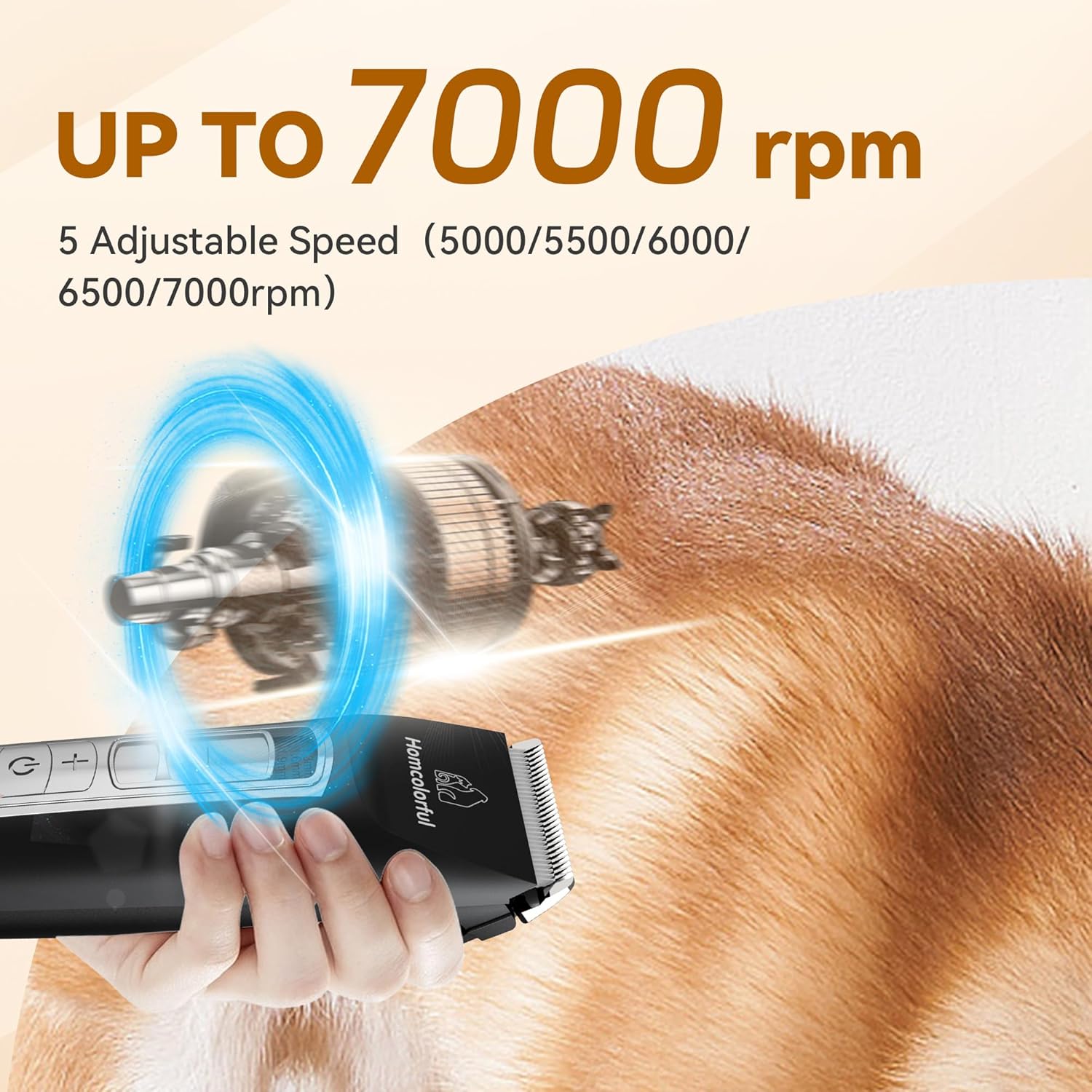 {5 Adjustable Speed}Homcolorful dog hair clipper features a 5-speed adjustable motor ranging from 5000 RPM to 7000 RPM, catering to the needs of different hair textures and densities.