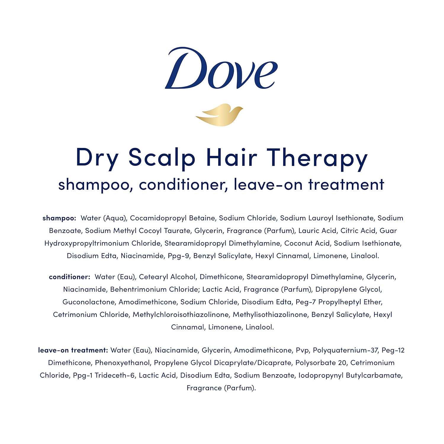 Soothe scalp dryness and treat your hair to the nourishment it deserves with our Hair Therapy Dry Scalp Care Shampoo, Conditioner and Leave In Scalp Treatment – part of our Dry Scalp Care 3-step system. Inspired by skin care, this nourishing system gives you our classic, gentle formulas and expert care – all rolled into one. Infused with vitamin B3, this 3-step system helps protect your skin’s barrier and lock in moisture. When used as a 3-step system, our regimen set is clinically proven to relieve scalp dryness. Our Dry Scalp Care system, with a blend of potent moisturizers and nourishing ingredients, targets your hair on a cellular level** – leaving you with beautiful, healthy-looking strands wash after wash. Giving you dry scalp care that goes further, you can count on this nourishing shampoo to leave your scalp feeling refreshed – and with soft hair, you’ll love running your fingers through. Perfect for: Soothing scalp dryness: If you’re looking to soothe scalp dryness, when used as part of our 3-step system – shampoo, conditioner, and leave-on treatment – this nourishing system, with vitamin B3, is clinically proven to relieve scalp dryness*. Beautifully soft hair: This system will help to make hair smooth and soft with every use. Being kinder to the planet. Globally, Dove does not test on animals. Our Hair Therapy Care range carries the PETA cruelty-free logo for added peace of mind.
