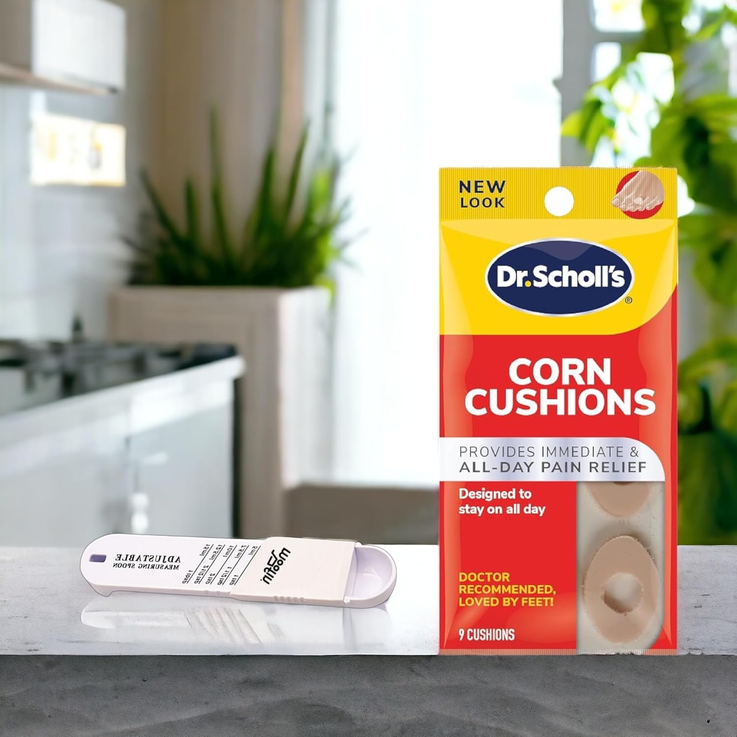 Dr. Scholl’s Toe Cushions for Pain Relief, 9 ct, Corn Removers for Toes with Moofin Plastic Measuring Spoon, Durable Hypoallergenic Corn Pads, Advanced Formula for Foot Comfort and Care, [Pack of 6]