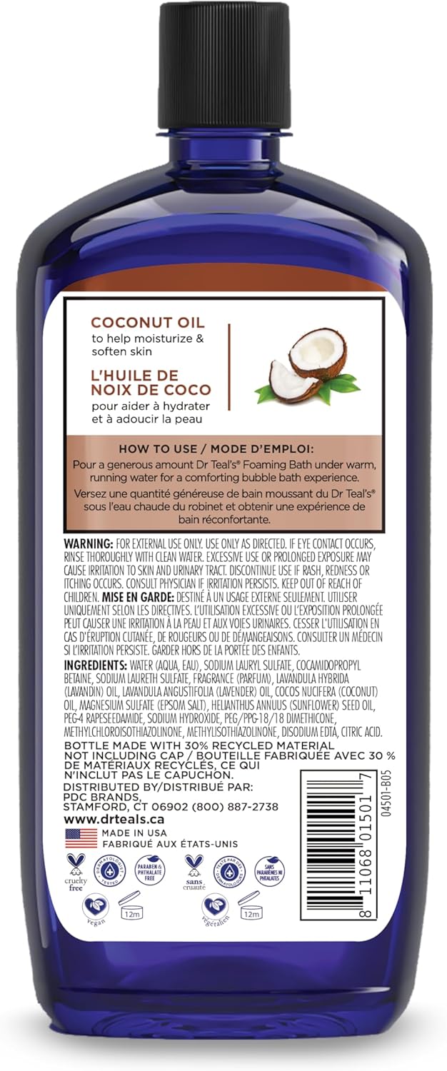 INDICATIONS:Dr. Teals Foaming Bath With Pure Epsom Salt Coconut Oil To Protect Skin Relax, refresh and revitalize with Dr. Teal’s Foaming Bath. This soothing bubble bath moisturizes, softens and soothes in one easy step. Dr. Teal’s coconut oil bath is infused with Epsom salts to relieve minor aches and muscle pains as you soak. Coconut oil provides intense hydration, moisturizing and softening even dry skin. Its rich coconut scent whisks your senses away to a tropical island, for an ind