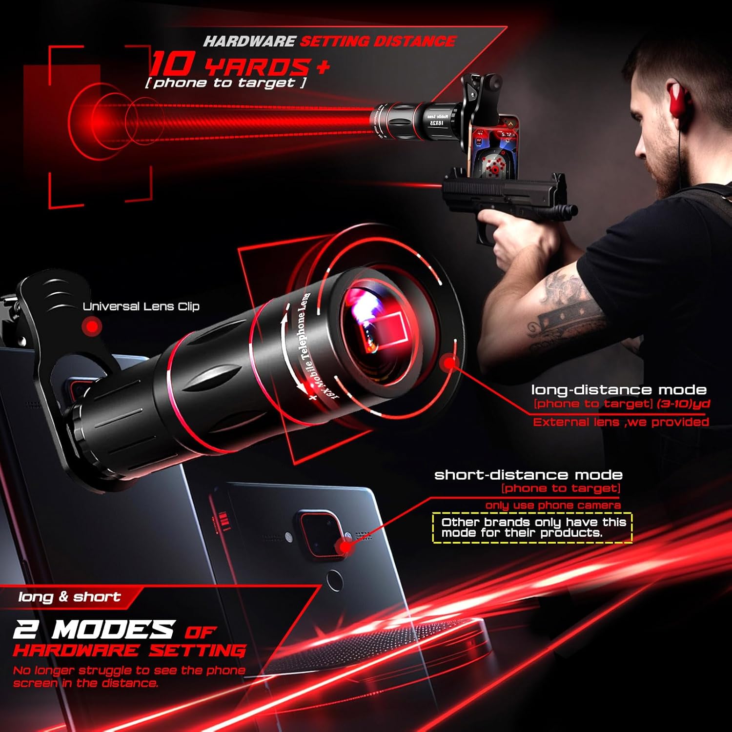 We offer two hardware setup modes: 1. Using the phone’s built-in camera. 2. Using the external lens. You have the flexibility to place your phone at any distance from the target, ranging from 0 to 10 yds+, to accommodate your training needs at different distances. This is our unique advantage. Typically, when using other brands’ products, you can only place your phone within 1 yard of the target. so, when shooting from far, you won’t be able to see the screen. Our product significantly enhances your shooting experience. We have successfully resolved this issue.