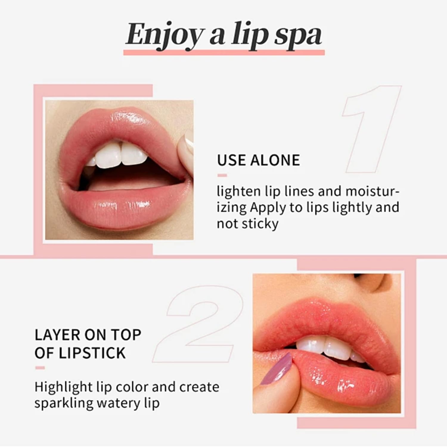【Multi Use】Use alone – Apply gently to lips, non-sticky, keep lips full and shiny all day long. Layer on – Apply a layer on top of lipstick to highlight lip color and create a hydrated and shiny lip look.