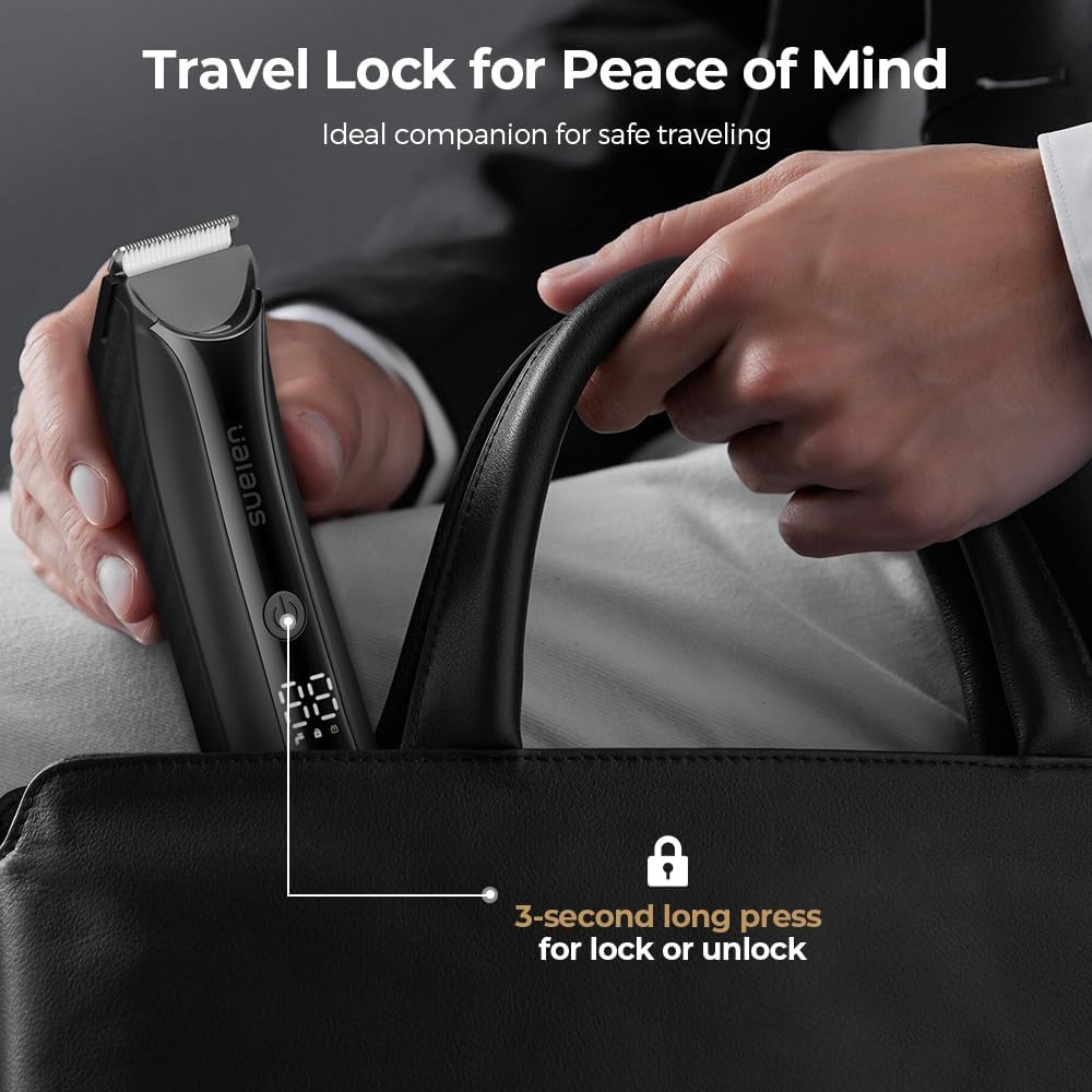 Portable & Travel Lock Feature: Purse-sized pubic hair trimmer not only for regular grooming routine, but also for travel touch-ups, making it a great tool for travel grooming needs. By simply pressing and holding, you can activate the travel lock feature of the groin hair trimmer for men, preventing accidental switch-on and guarantees safety during travels.
