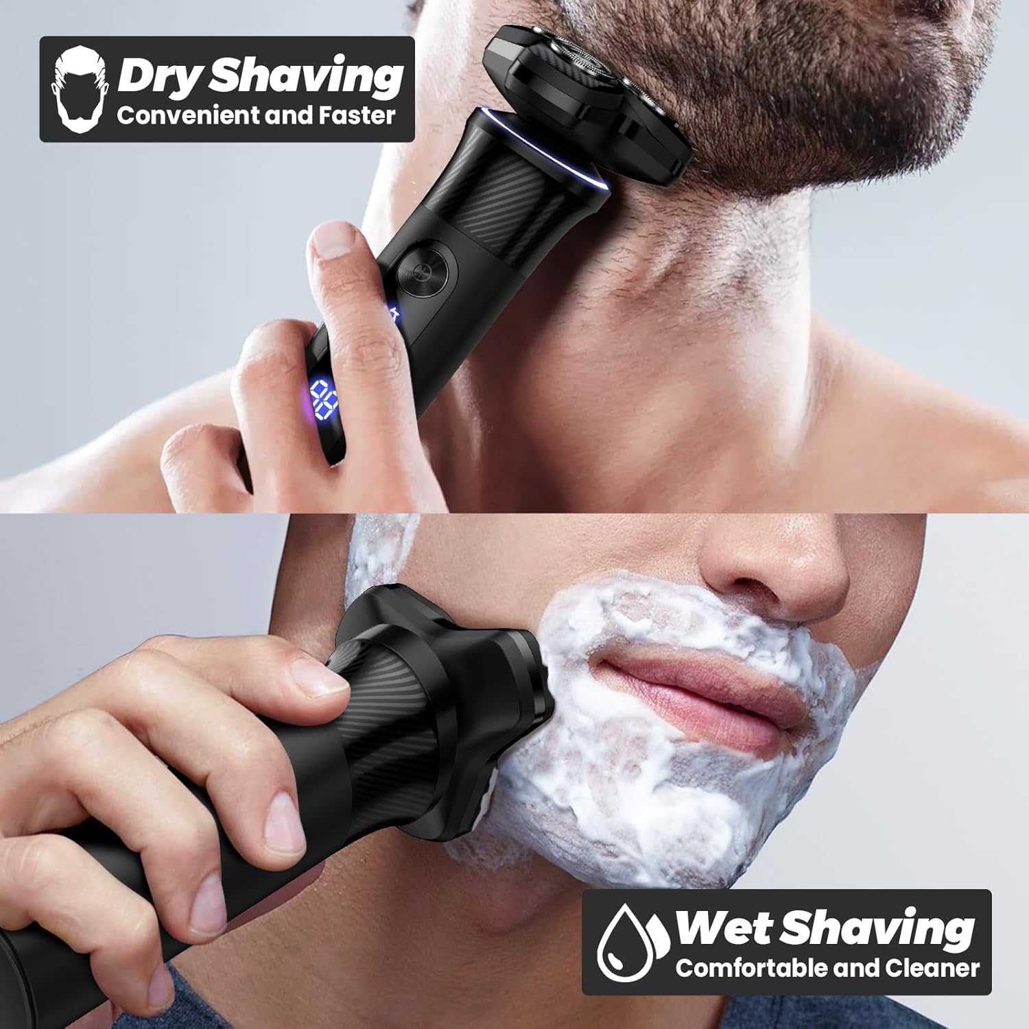 【IPX7 Waterproof & Smart Screen Display】: The entire body of the electric shaver is waterproof. This men’s electric shaver can be used for wet or dry shaving, and can be rinsed directly with water. It has 4 smart screen prompt functions, and a battery prompt And cleaning reminder, smart travel lock icon, gear switching (high-speed mode acceleration symbol light is always on, low-speed mode acceleration symbol light flashes), Automatically remembers the last used gear when shutting down.