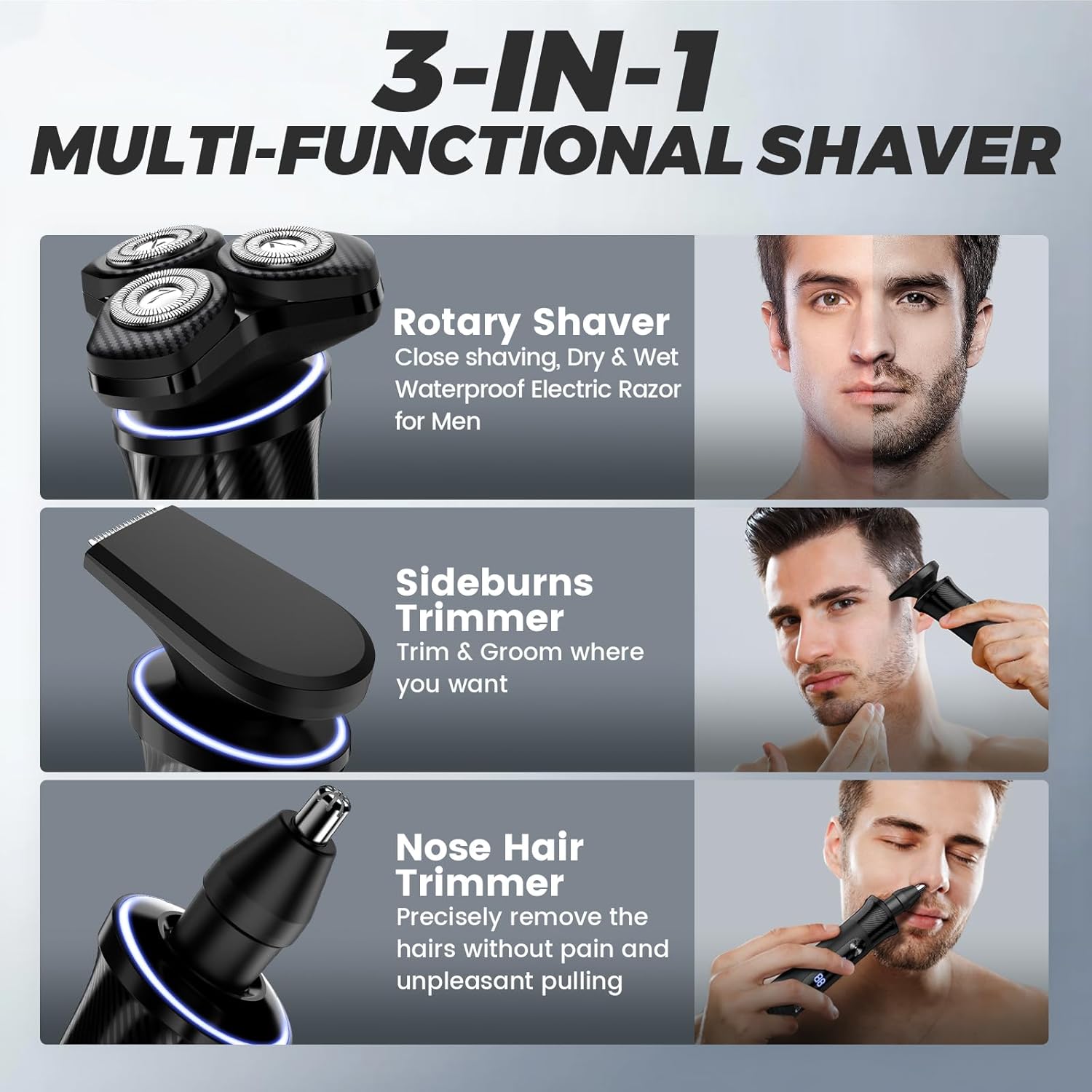 【3-in-1 Shavers for Men】: Men’s 3-in-1 electric razor, including three easily removable heads, with men’s electric shaver, nose hair trimmer and sideburn trimmer. Meet our daily shaving, cleansing and reshaping sideburn needs. The shaver is ergonomically designed and very easy to hold, making it perfect gift for your husband, boyfriend, father, elders and yourself. The package comes with a dust cover, which is very convenient to store and carry when traveling at home.