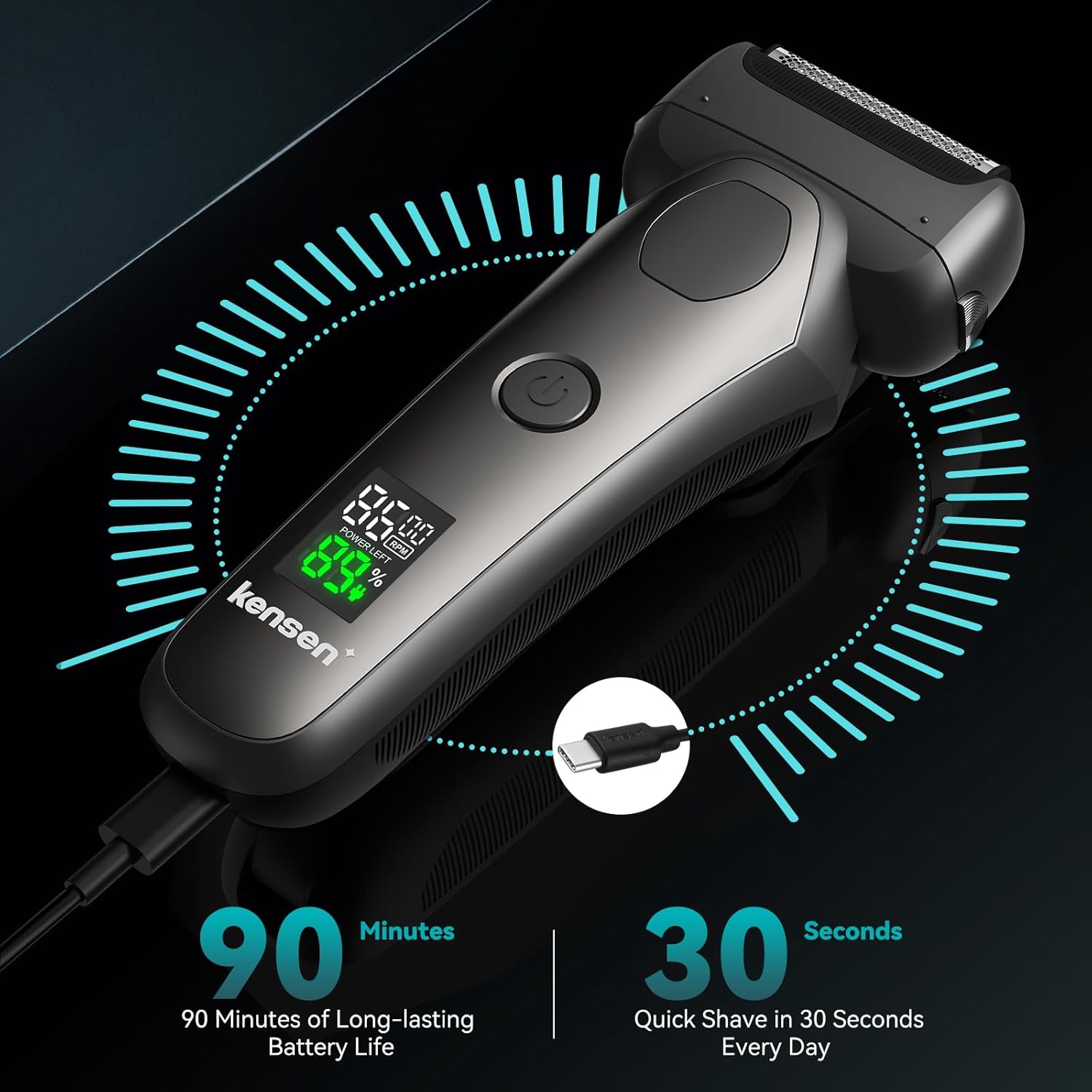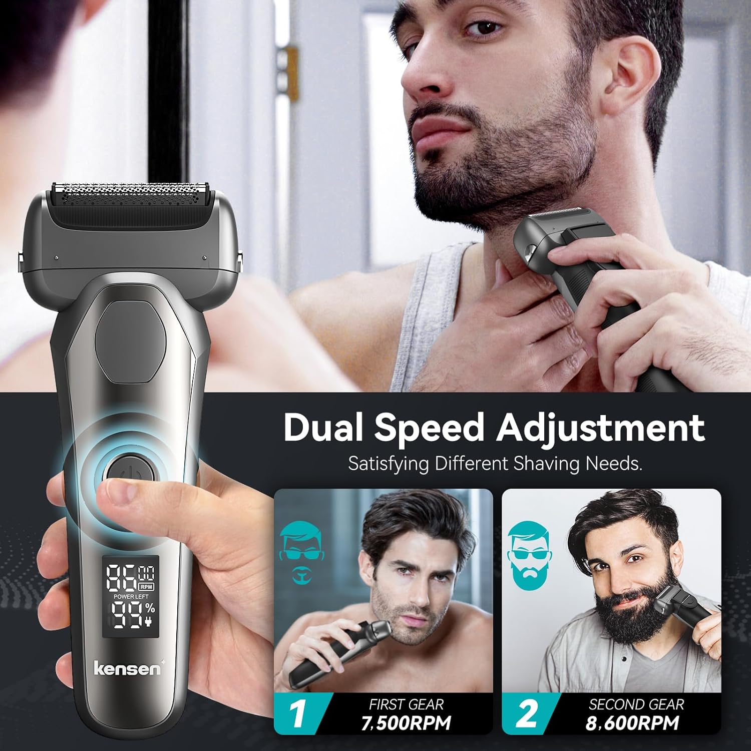 Electric Razor for Men, kensen Men’s Double Speed Foil Electric Razor, Wet/Dry IPX6 Waterproof Electric Shavers for Men with Pop-up Beard Trimmer, Cordless Rechargeable Mens Razor