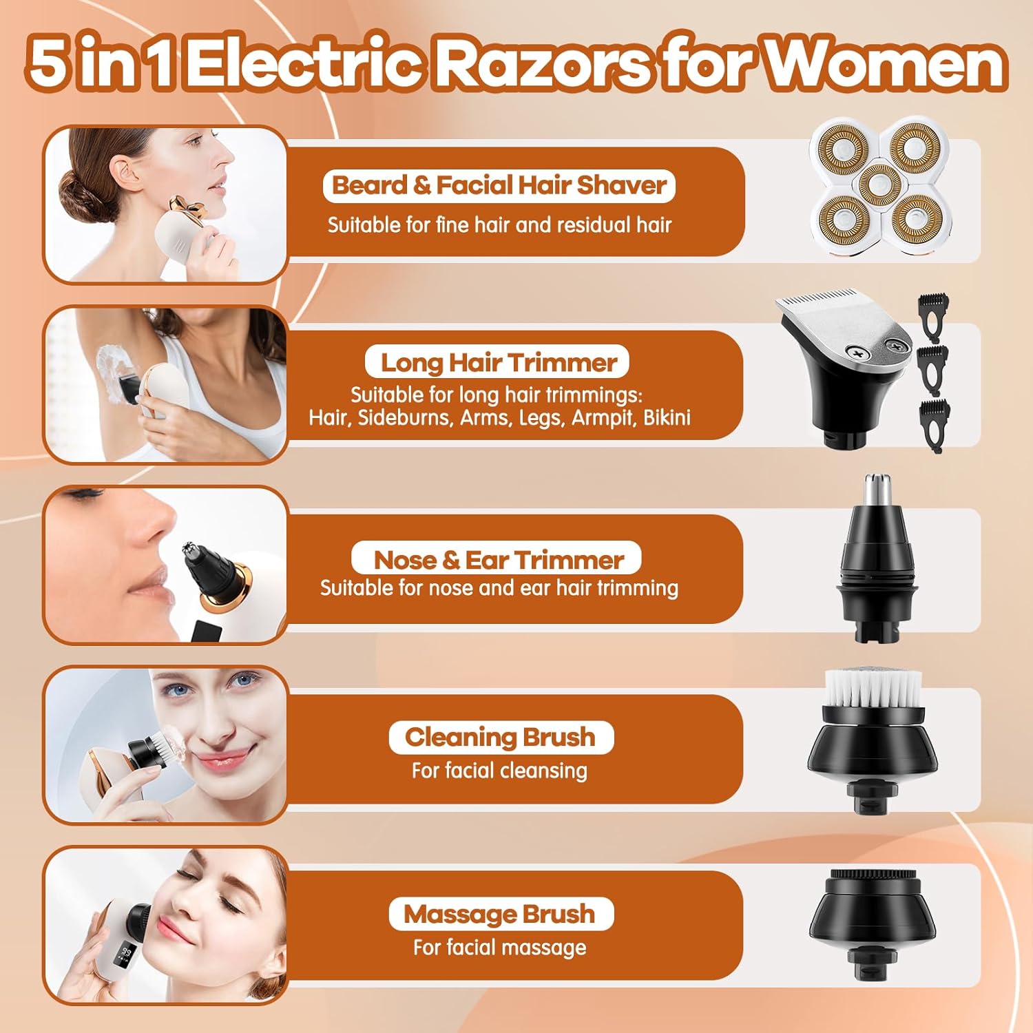 Electric Razors for Women, 5D Facial Hair Removal, 5-in-1 Wet/Dry Bikini Trimmer, Electric Shaver for Women, Rechargeable Face Shaver for Arms Legs Armpit Pubic Area, Painless Womens Grooming Kit