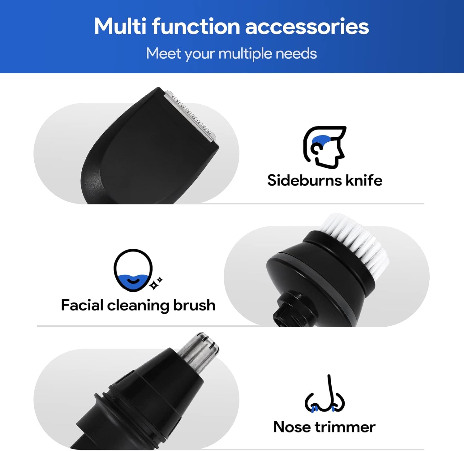 [4-in-1 Trimmer Kit] With four attachments including 9D floating head, Beard trimmer, Nose Trimmer, Face Cleaning Brush, it could satisfy your facial cleaning demand.