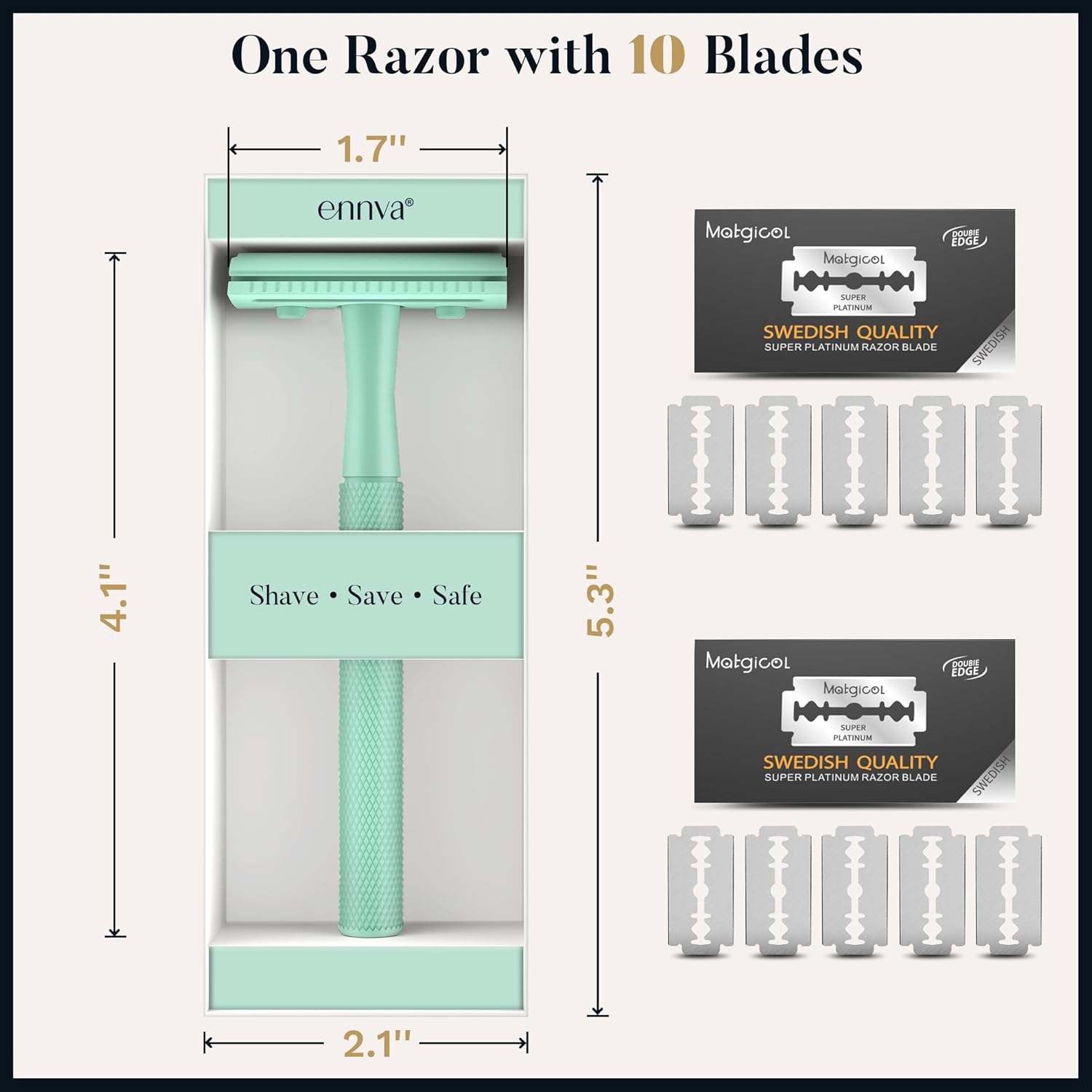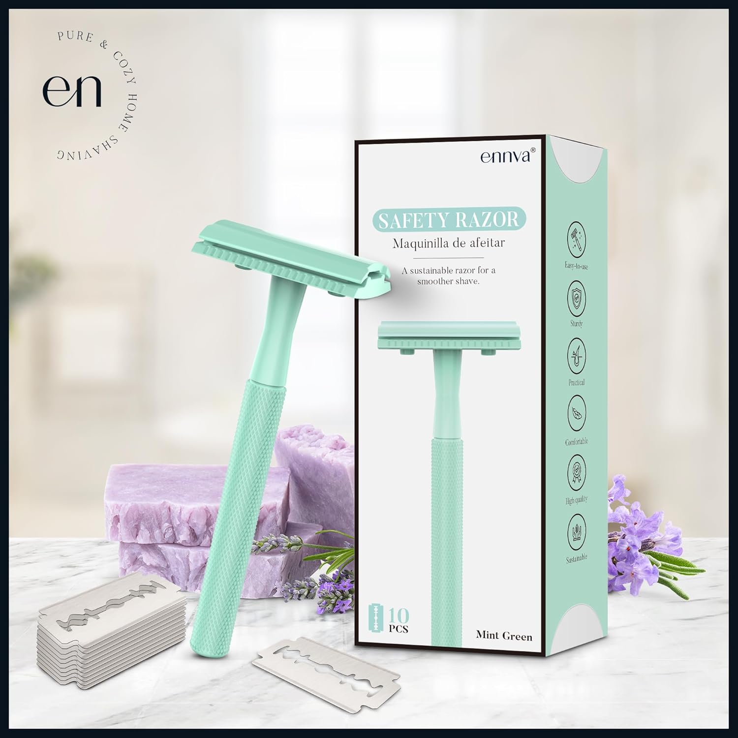 ENNVA Double Edge Safety Razor, Single Blade Razor with 10 Blades, One Blade Razor for Women, Razors for Men One Blade, Reusable Razor Women, Metal Safety Razor Kit, Free of Plastic – Mint Green