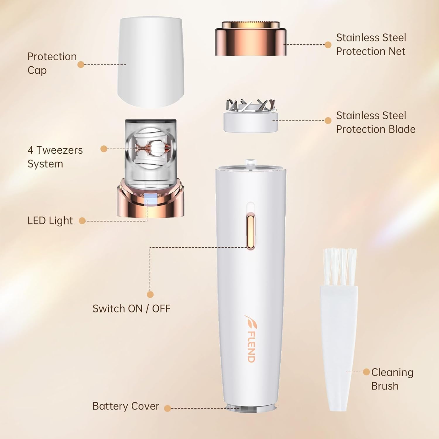 Flend Mini 2 in 1 Facial Epilator for Women and Bikini Trimmer Hair Removal Device meets all of your hair removal needs! You can enjoy the perfect hair removal experience without spending a lot of money. Facial Lady Shaver This Bikini Trimmer uses like massage, gentle for all skin types, and easy to use in daily. Unlike traditional chemical hair removal methods or hair removal pliers that take about an hour to remove hair and cause great pain during the hair removal process, this hair trimmer can remove hair in five minutes without feeling pain or uncomfortable. Face Epilator for Women Features for long-lasting hair removal and as short as 0.5mm under less pain. The smooth glide epilator for women face provides easy and comfortable epilation for all areas of the body to remove unwanted hair, leaving the body skin smooth for up to 4 weeks. Low Noise Facial Epilator and Lady Shaver The Electric Facial Hair Removal for Women is very low noise, so that you will not disturb others when hair removal. No more embarrassing moments. Built in LED light The LED light of this Hair Removal Device can increase visibility, even in the dark, you can easy to hold this hair remover for women epilator and lady shaver doing epilation and shaving. No Irritation & Bumps & Scratch The thin and sharp blade makes fast and accurate epilating and shaving, No hair clip, no hair pulling with the fine steel hair removal cutter head. Mini Facial Epilator and Bikini Trimmer for Travel This The compact size makes the epilator perfect to fit in travel bag. No longer worry about hair removal when traveling! /p> GUIDE 1, Be sure that the skin where you plan to shave is clean. 2, Use facial epilator on wet skin to get better result. Note: Blade head waterproof only, do not wash the whole body.