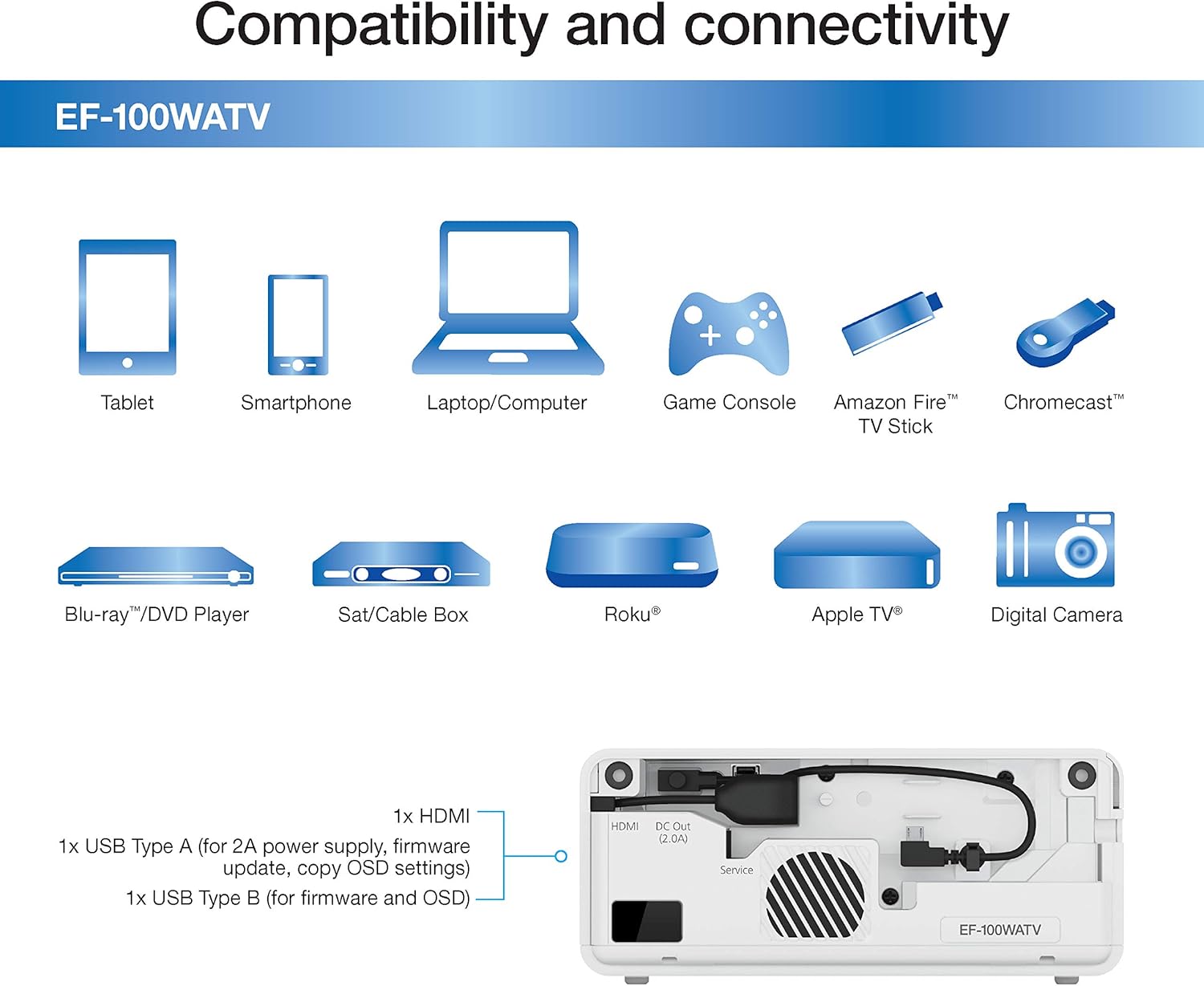 ELEGANT COMPACT DESIGN – Designed with simplicity in mind, the Epson EF-100 has a clean, compact, and modern design available in white and silver, or black and copper to beautifully fit within any décor.