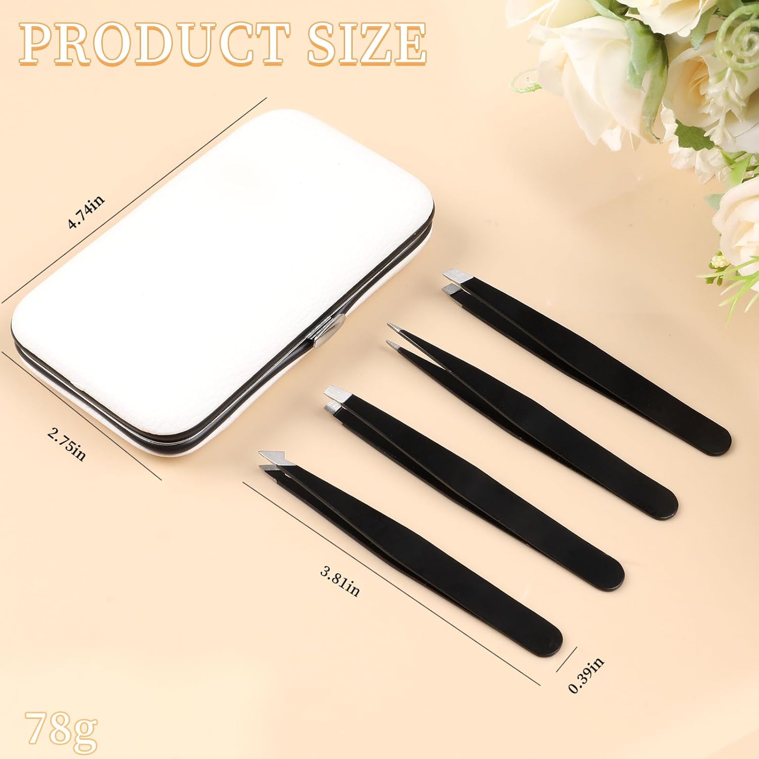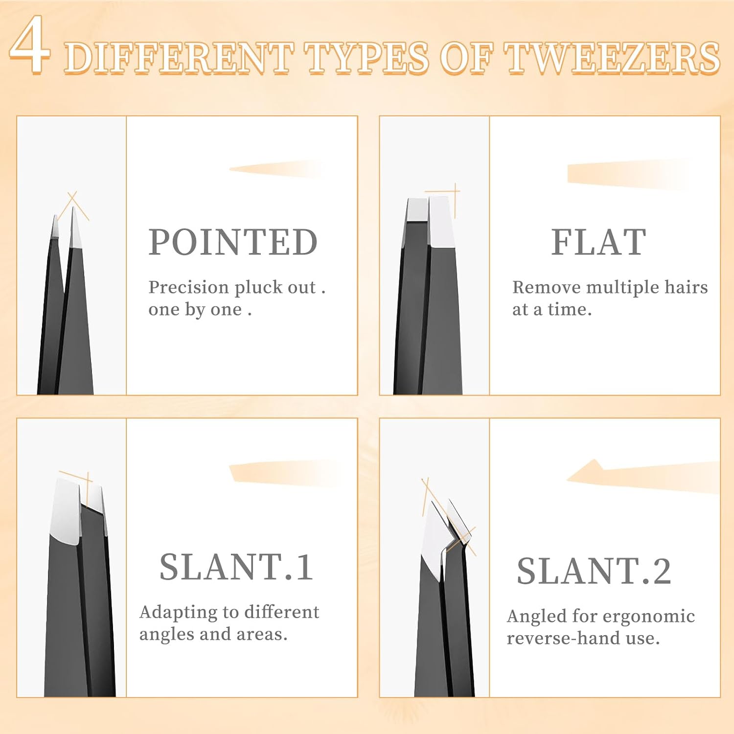 🎧4-PIECE PRECISION TWEEZERS SET: This set contains classic, slant, pointed, pointed and slant tweezers to meet different needs. Each tweezer for eyebrows is of high quality, lightweight and portable, not easily deformed, and elastic, making it easy to handle various problems.