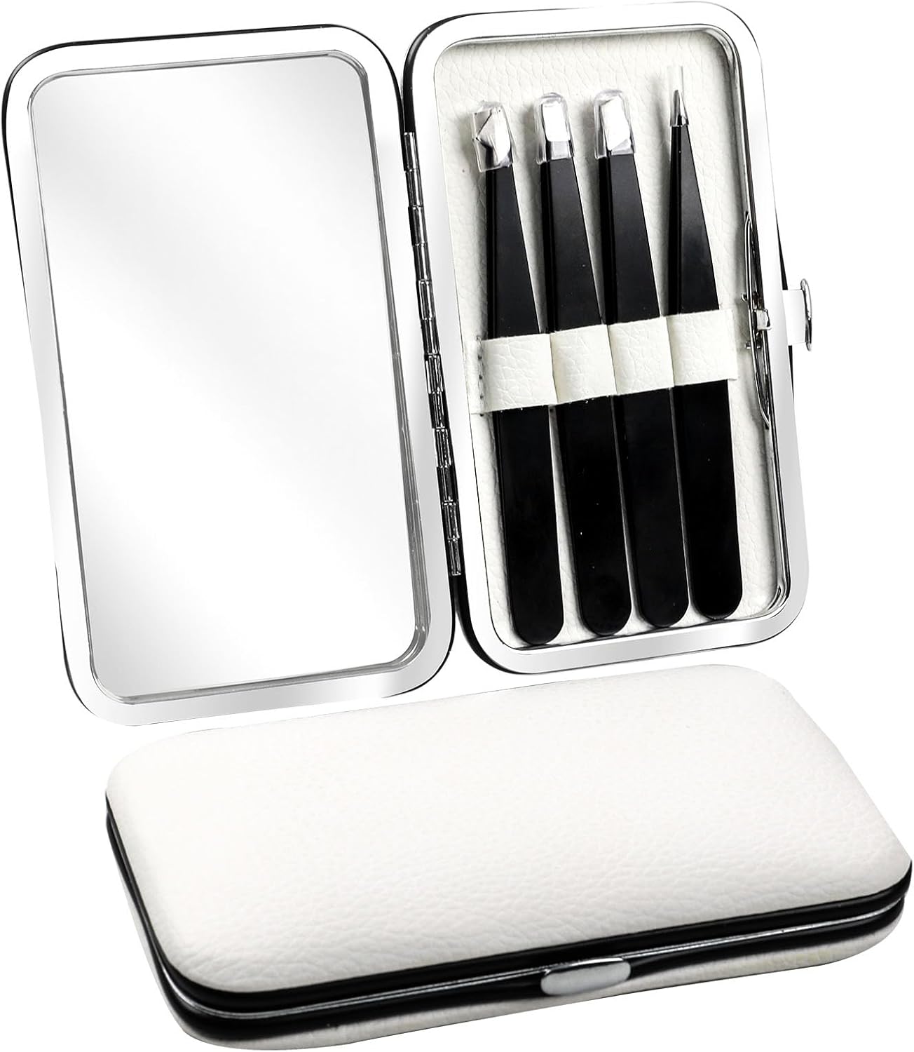 Eyebrow Tweezers,Tweezers for Women Facial Hair Tweezer Set with Slant Tweezers and Needle Nose Tweezers for Facial Hair, Splinter and Ingrown Hair Removal with Mirror Case (Black)