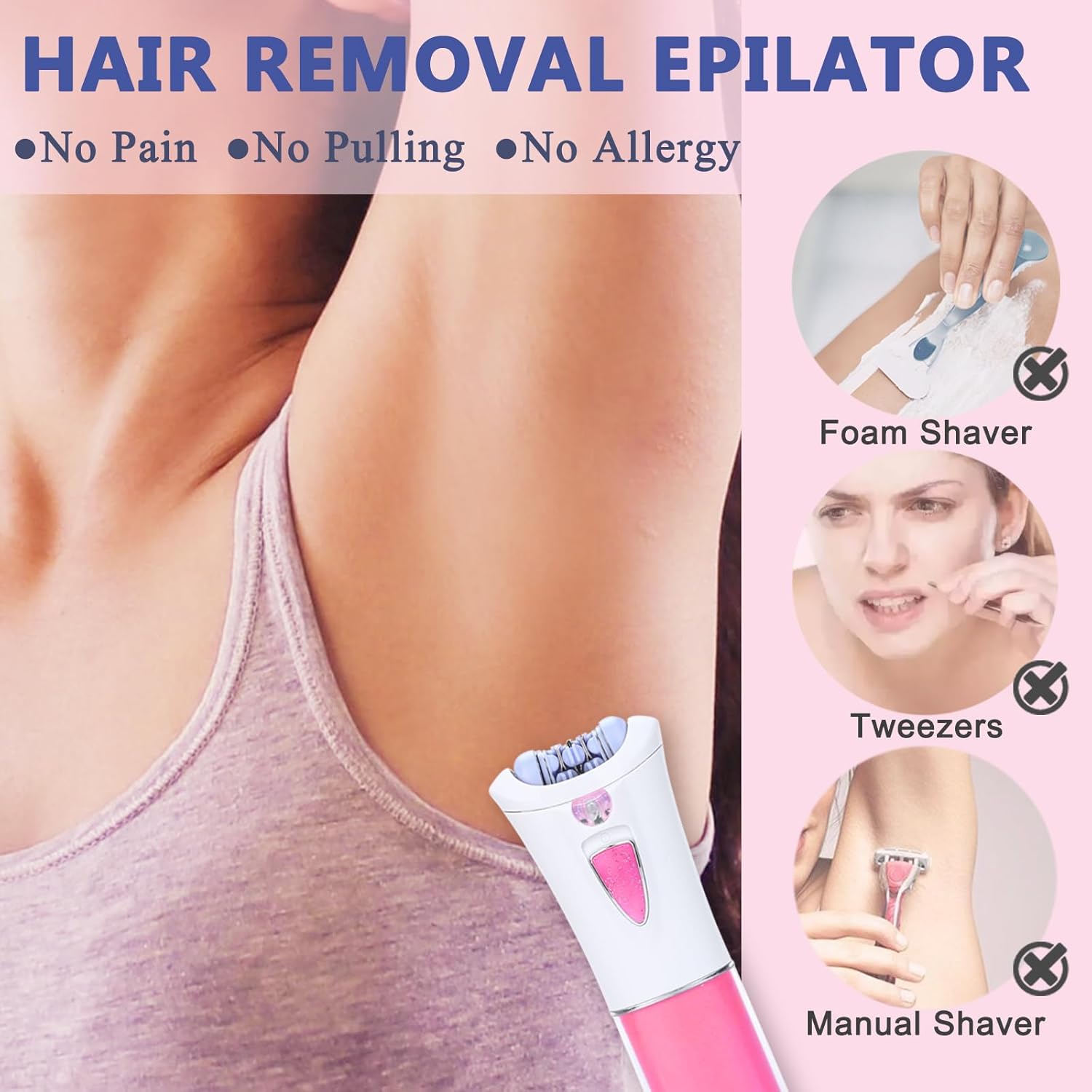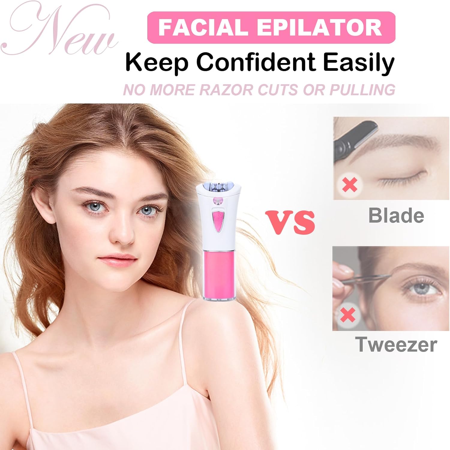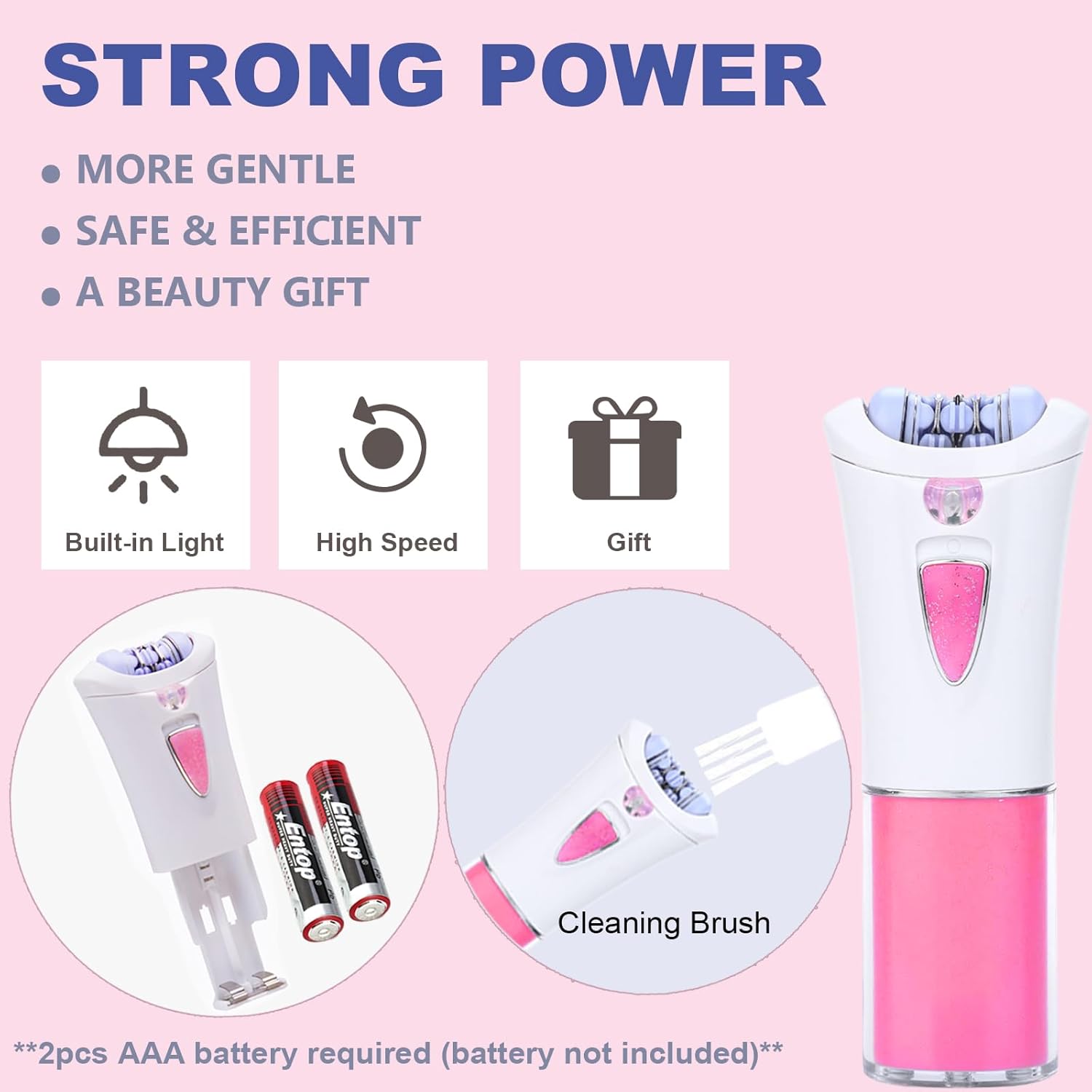 Exquisite Shaving Head The floating blade head glides closely along the contour of your skin, removing fine hair from face and arms effectively and safely. Reveal a smooth new look with every inch of your skinHigh-Quality Stainless Steel Blades The electric shaver is used to premium stainless steel blades with double tips and 1 mm thickness, removing unwanted hair fast and reliably. The mesh blade cover protects your skin from direct contact with the blade, reducing nicks, cuts, and irritation Facial Hair Remover is a revolutionary new device that erases facial hair instantly and painlessly No symptom of redness from skin irritation and the Pain and swelling are rare You don’t miss a hair, even the finest hairs, and peach fuzz. From the upper lip, cheek, chin, eyebrows or anywhere, it makes the procedure versatile in its uses everywhereWarm Tips: 1. Please do not put the device into water 2. The epilator is powered by 2 AAA batteries (not including) Product Specifications: Item Name: Electric Facial Epilator Color: Pink Product Size: 4.7*1.8*0.8 inch Power: 2pcs AAA batteries ( battery not including) Package Including: 1 * Facial Hair Epipator (without battery) 1 * User Manual 1 * Cleaning Brush 1 * Storage Bag