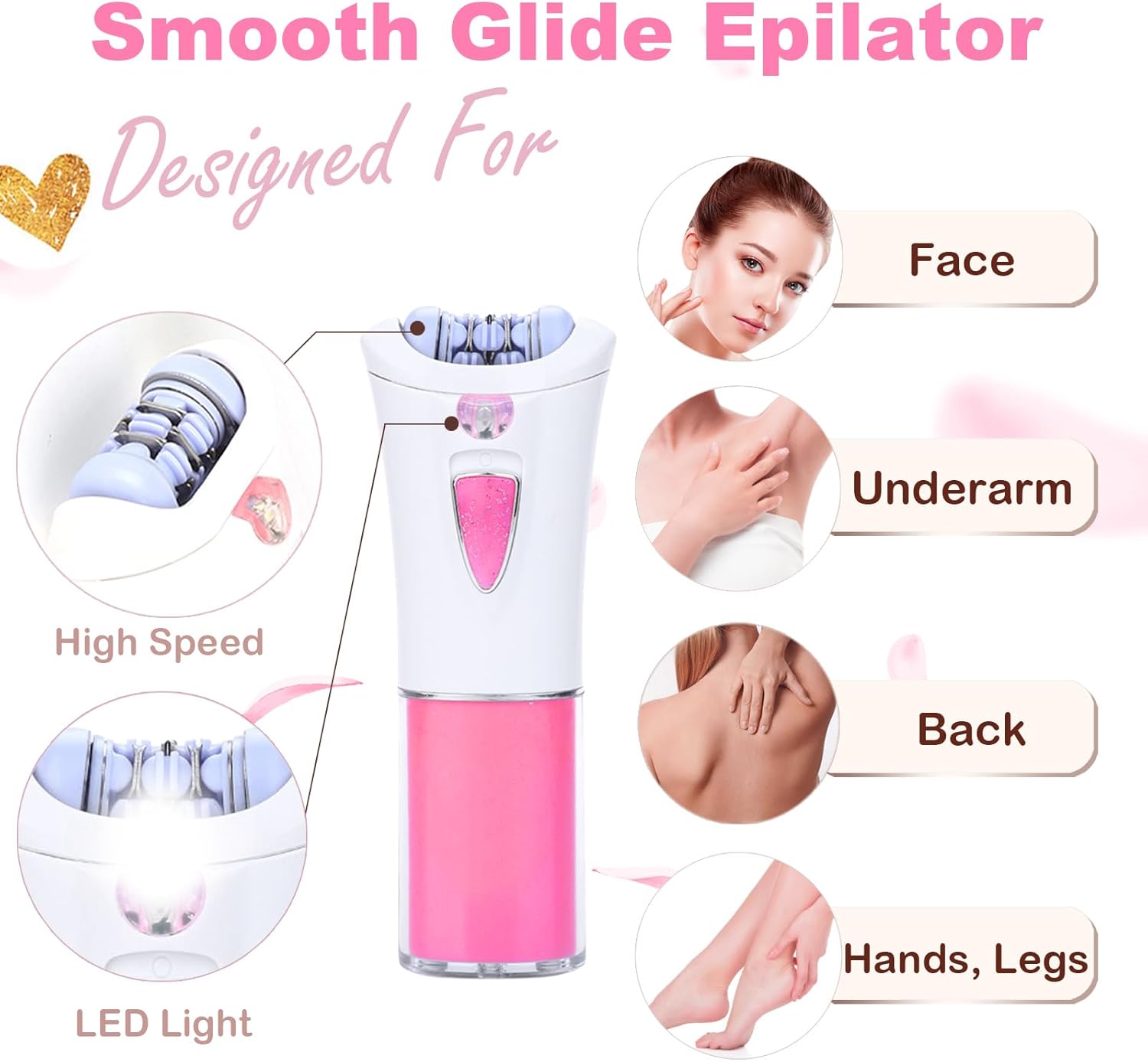 Facial Epilator for Women – Glabrousskin Epilator Hair Removal for Face – Electric Smooth Glide Glamorous Skin Epilator – Shaver Remover for Bikini Trimmer for Face, Chin, Back, Body (Pink)