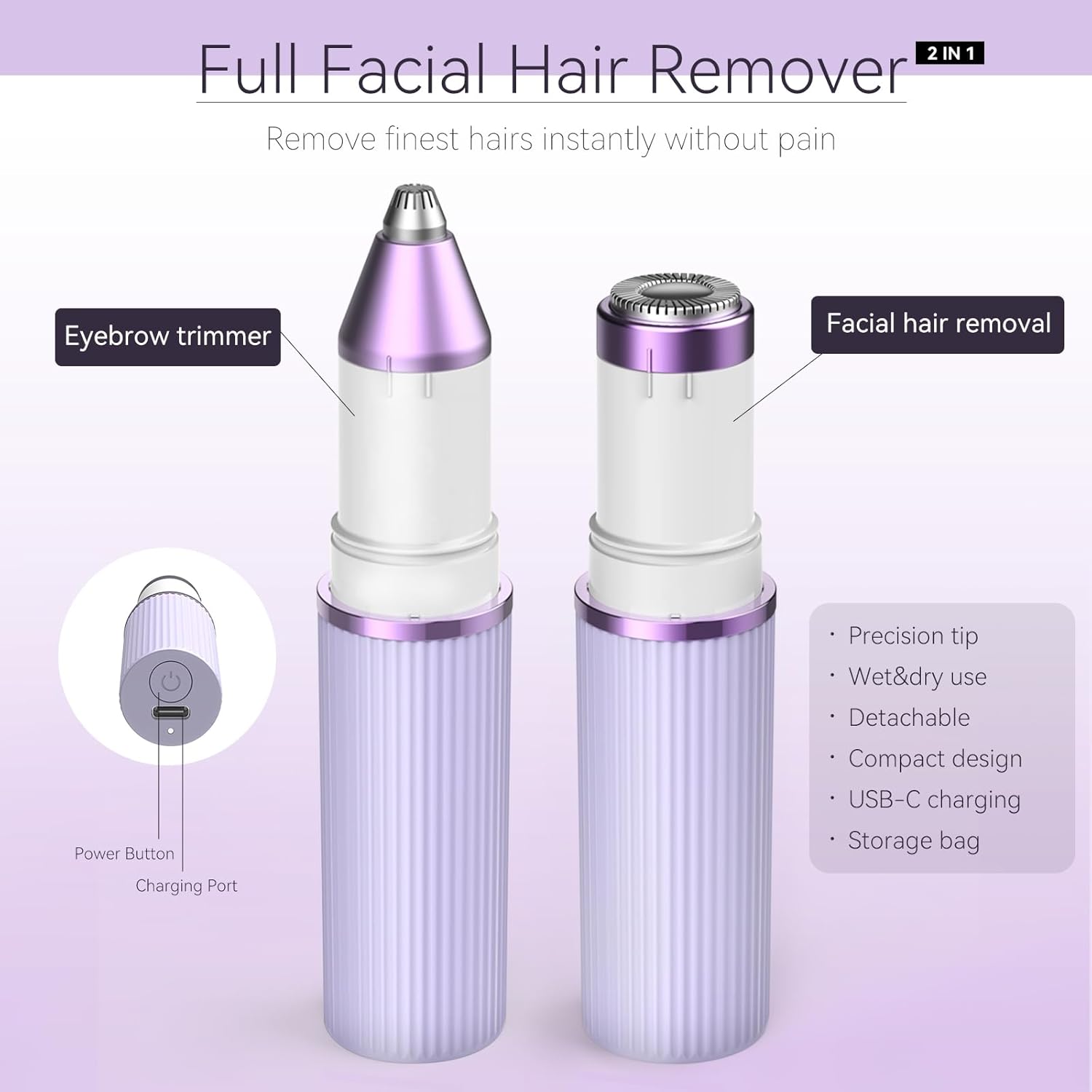 Facial Hair Removal Kit for Women, Bautrium 2-in-1 Lady Face Shaver & Eyebrow Trimmer for Lips Chin Fingers, Mini Hair Epilator Remover Tools with USB Charging Cable & Storage Bag, Lavender