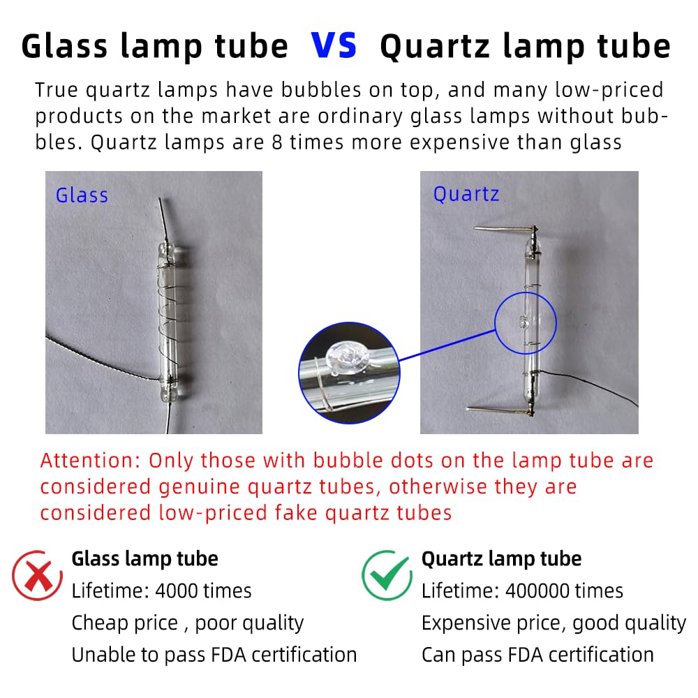Laser Hair Removal At Home Permanent & Painless。 The light source made of glass tube material cannot pass FDA certification, The key point lies in the lifespan of these two types of lamps. If the glass lamp tube is guaranteed to have hair removal effect, it usually only emits light 2000-4000 times. A total of about 2000 hair loss occurs throughout the body. If you want to remove hair, even for small areas, glass tubes are definitely not enough. However, quartz lamps are different. The overall effective hair removal and light output times are generally over 100000 times, and even thicker lamps can achieve 400000 times of light output. So, when buying a photon hair removal device, be sure to identify the quartz tube. Due to the different manufacturing processes between glass and quartz, there may be some differences between quartz lamps and glass lamps. Because the softening point of quartz is much different from that of ordinary glass, the glass lamp tube extracts air from both ends, making it look very smooth and glossy overall. The quartz lamp tube directly extracts air from the middle, so the small bump in the middle is a protruding point formed by the extraction process. So as long as there is no protruding small bump in the middle, it is 100% glass tube and cannot pass FDA certification. A quartz lamp may not have a small bump in the middle, but there must be a small bump in the middle of the quartz lamp.